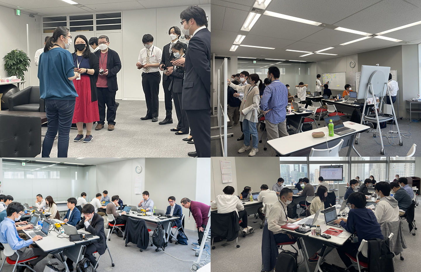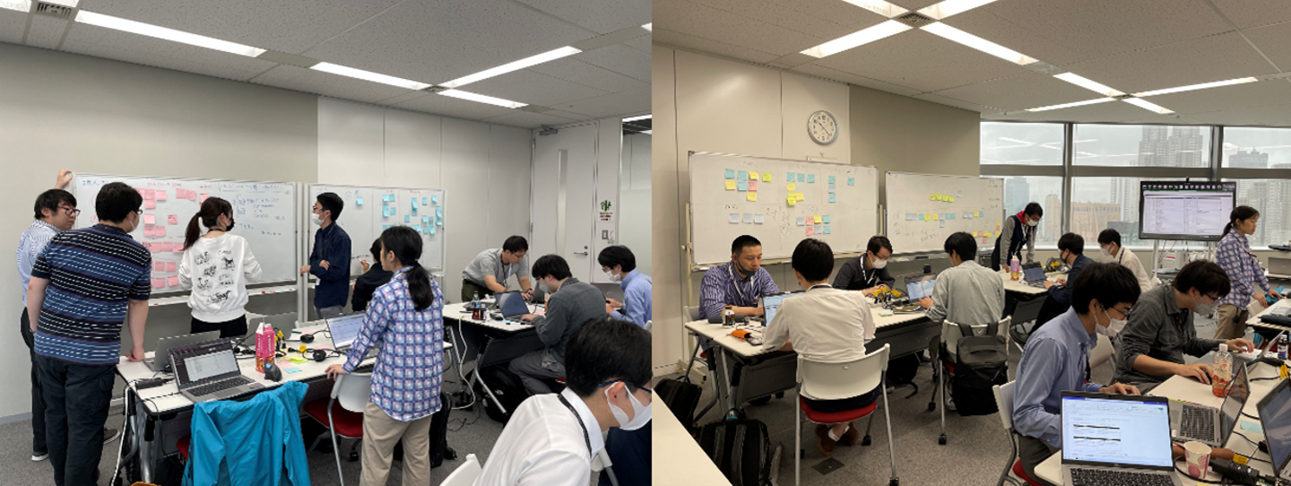 また、2023年度は、初めて新卒と中途採用混合での研修が実施されました。研修を通した感想として、新卒からは社会人経験者からの知見やビジネスマインドを間近で得られたという感想が、中途からは互いに切磋琢磨でき実践的な研修を通して刺激を受けたという感想がありました。また、いろんなバックグラウンドを持っていて、お互いの技術力を見ながら刺激になり、足りないところはお互いフォローしながら共に成長できたとの感想がありました。