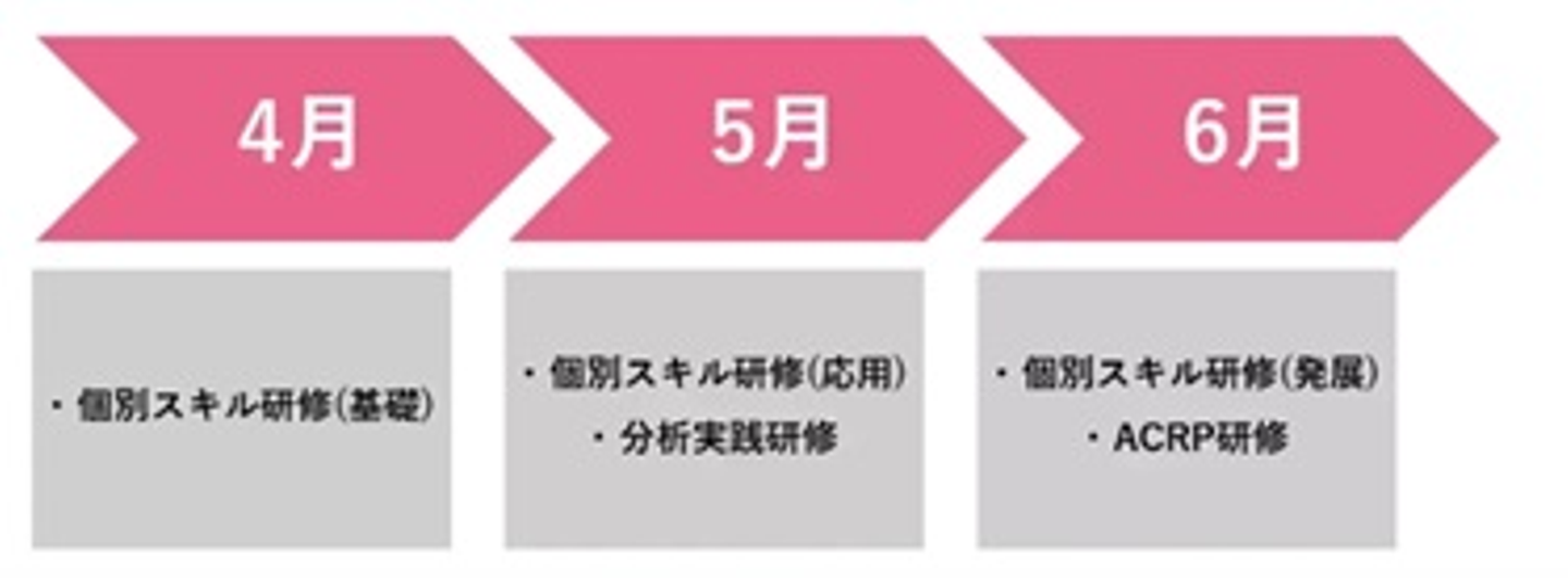 当社の新人研修は大まかに「個別スキル研修」「分析実践研修」「ACRP(Analytics Consulting Role Playing)研修」の3つの段階に分かれており、4月入社の場合は以下の流れで6月まで研修が進みます。