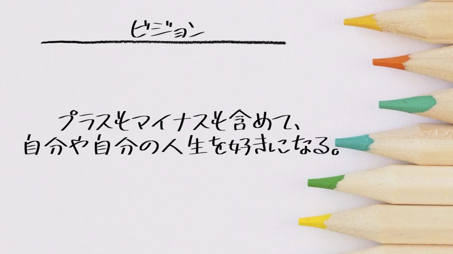 だから、マイナスをなくすのではなく、マイナスをありのまま受け入れいられる人生を歩める人を育てたいという思いから、「プラスもマイナスも含めて、自分や自分の人生を好きになる。」というビジョンが生まれました。