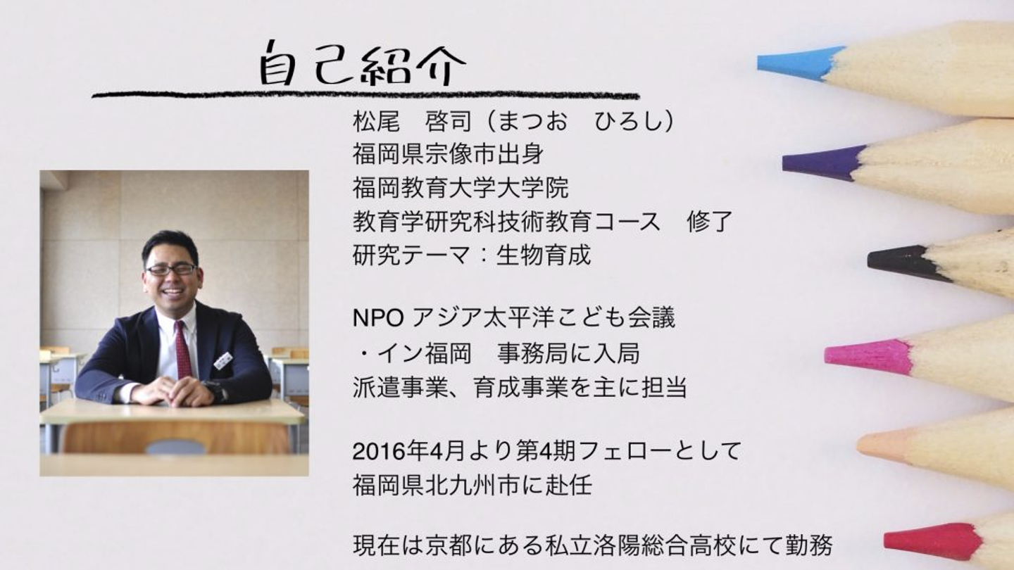 子どもたちに伝えたいことを学校現場で丁寧に実践していく松尾フェロー。様々な実践をしたからこそ見えてきた子どもたちや周りの人の変化と、その先の自身の夢。「校長先生になる!」と力強く語る松尾フェローの今後の活躍が楽しみです。