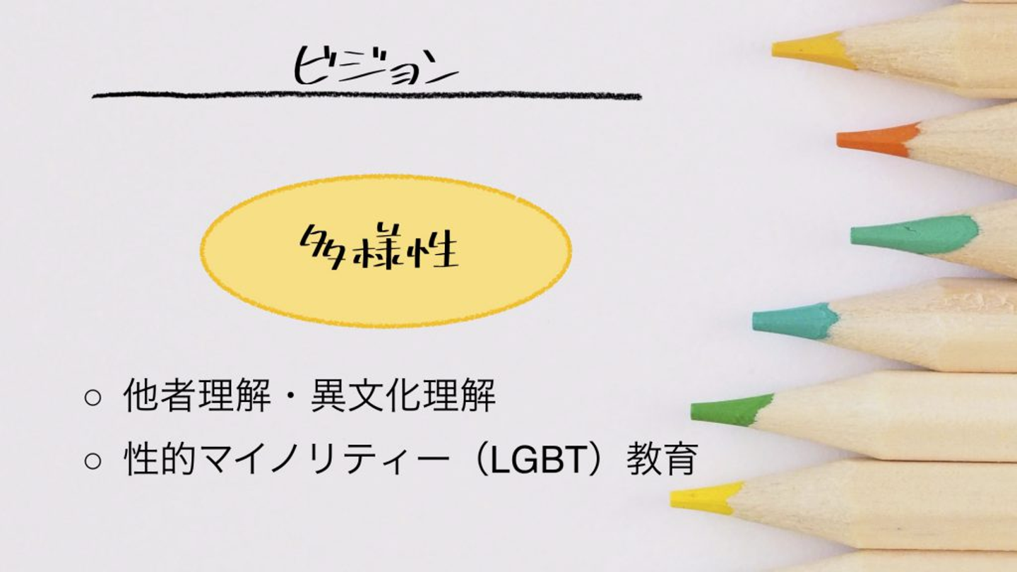 もう一つのビジョンは「多様性」を受け入れる心を持つ人を育てること。これは、もともと強く持っていたわけではありません。自分が多様性を大事にしていた経験を深掘りしていったときに言葉として出てきました。