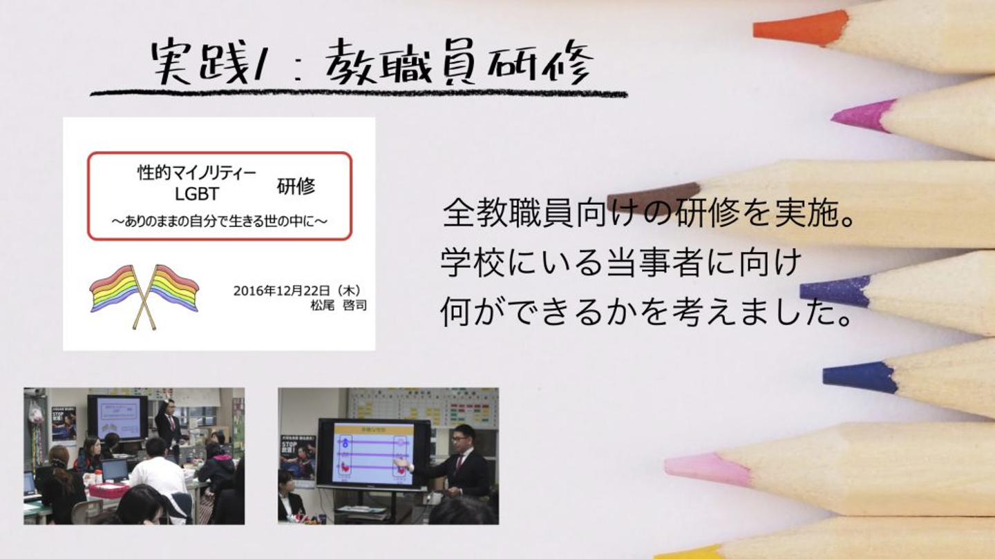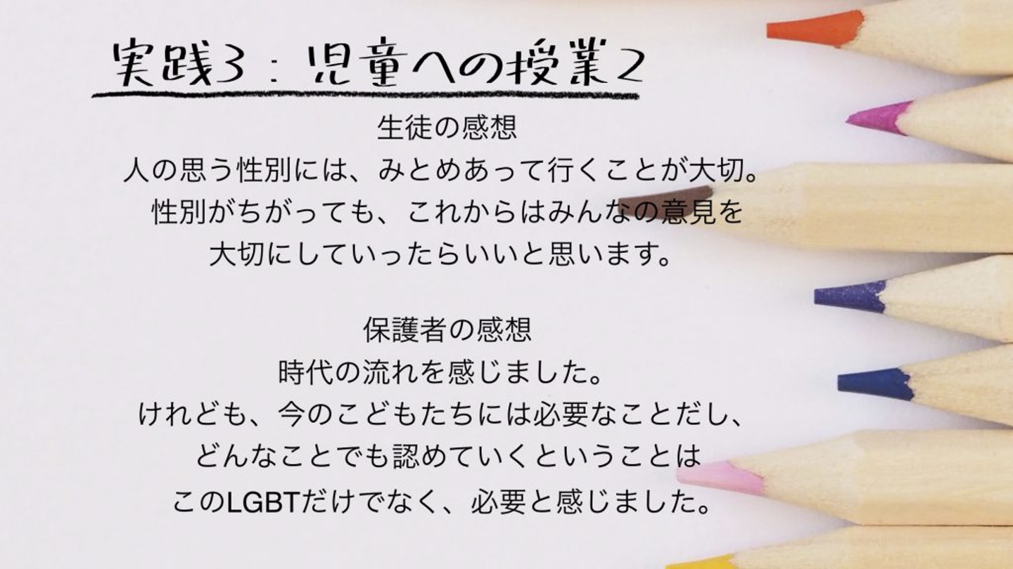 私が赴任していた学校では、人権の授業での授業参観を毎年行っていました。LGBTについて授業をしたいという思いがあったので、学校に提案しました。新しい取り組みでもあったので、最初はネガティブな反応もあったのですが、準備もすべて私自身がやるという約束で任せてもらいました。
