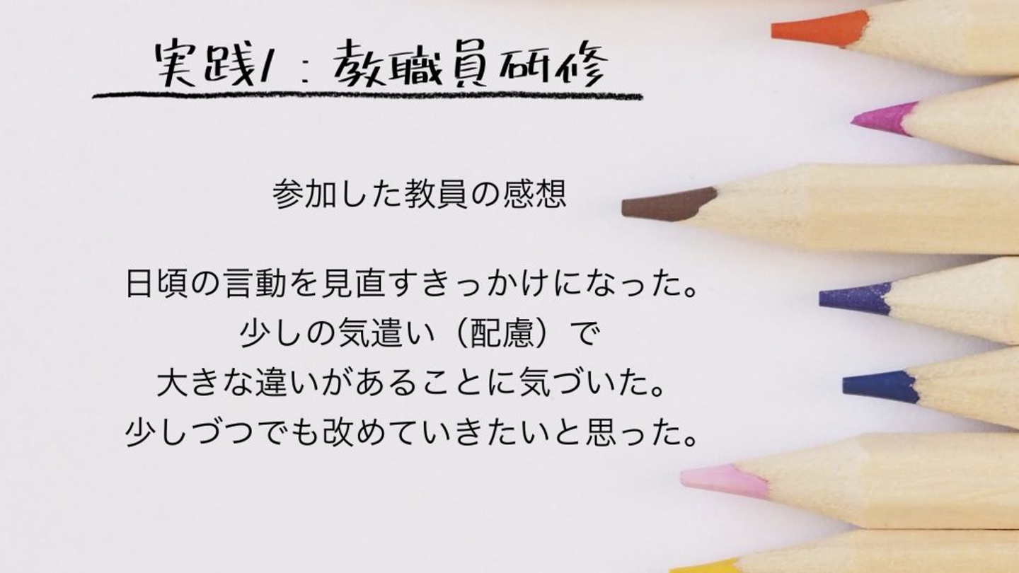 参加した先生たちから「少しの気遣いで大きな違いがあることに気づいた」という言葉をもらいました。関わる大人が変わることが重要ですね。