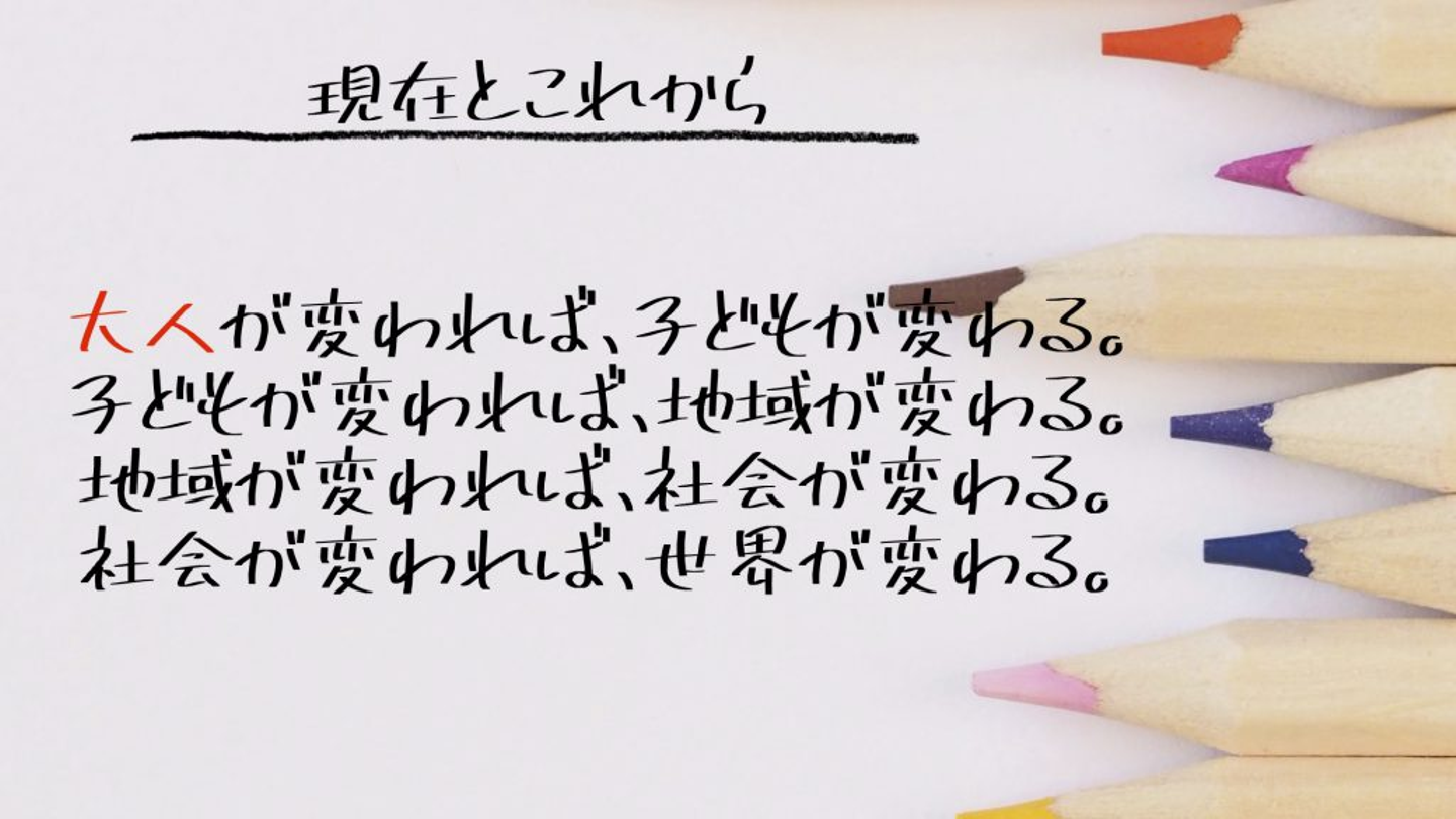 先ほど紹介した子どもや保護者の感想をみてもわかりますが、子どもが変わると保護者が変わります。そして、保護者が変わると地域が変わり、地域が変われば社会が変わる、社会が変われば世界が変わるのだと思います。