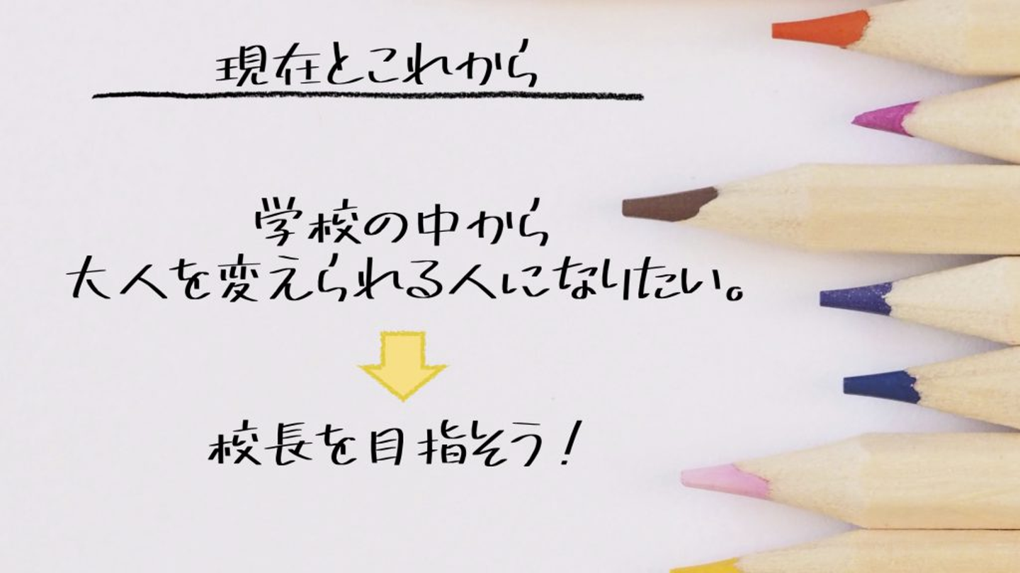 まず、大人が変わることが大事で、私自身は、ずっと子どもに関わることをしてきたので、学校の中から教師を変えたいと思っています。そのために、将来は校長先生になりたい。いま、そのために、私立の学校で修行させてもらっています。一歩ずつ、目標の実現に向けて歩んでいこうと思います。