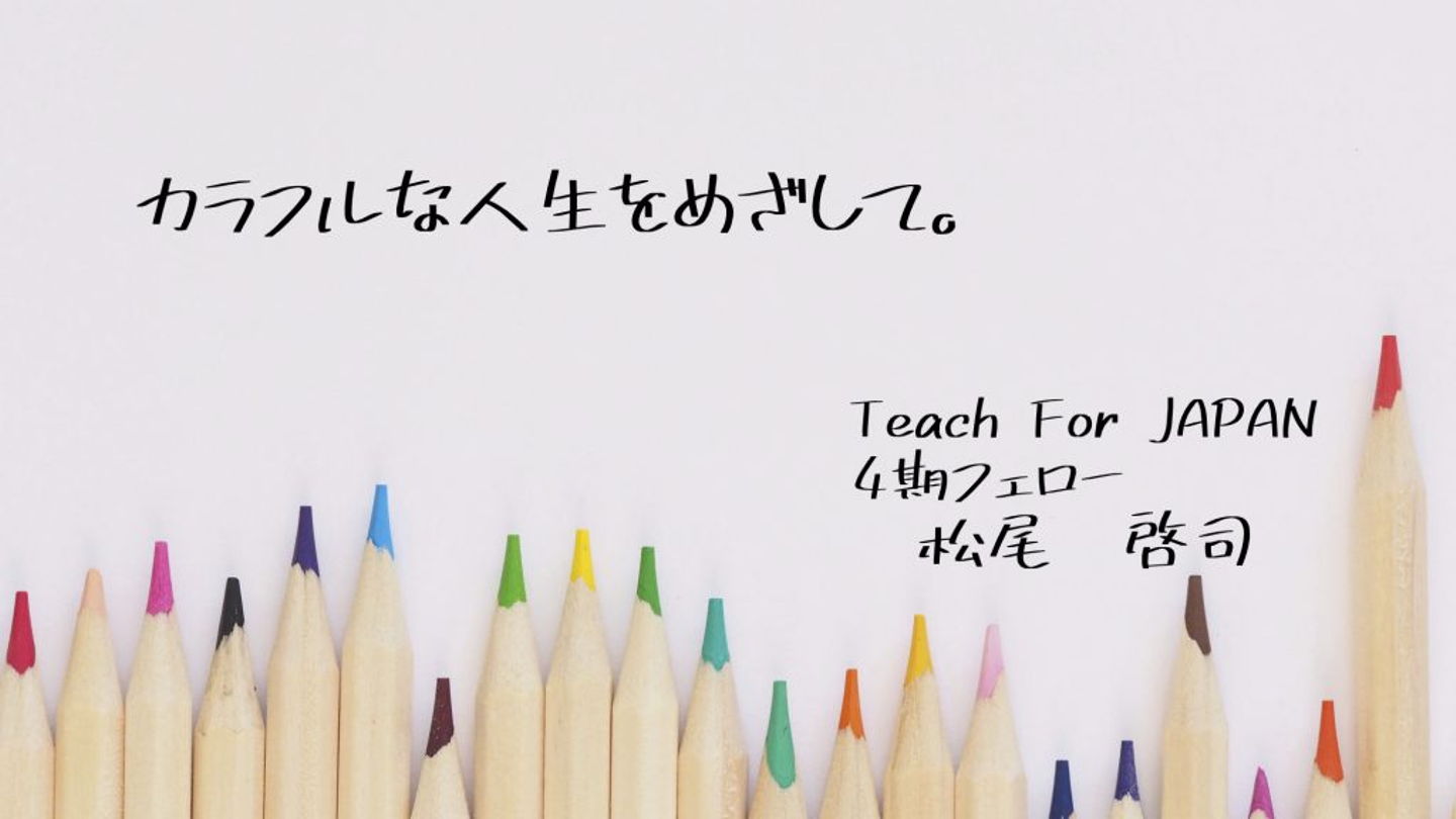 こんにちは。Teach For Japan 4期フェローの松尾です。子どもたちも、大人も、自分自身も、すべての人が「それぞれが自分らしく生きてほしい、そうあれる社会であってほしい」と思って、「カラフルな人生をめざして」というタイトルをつけています。
