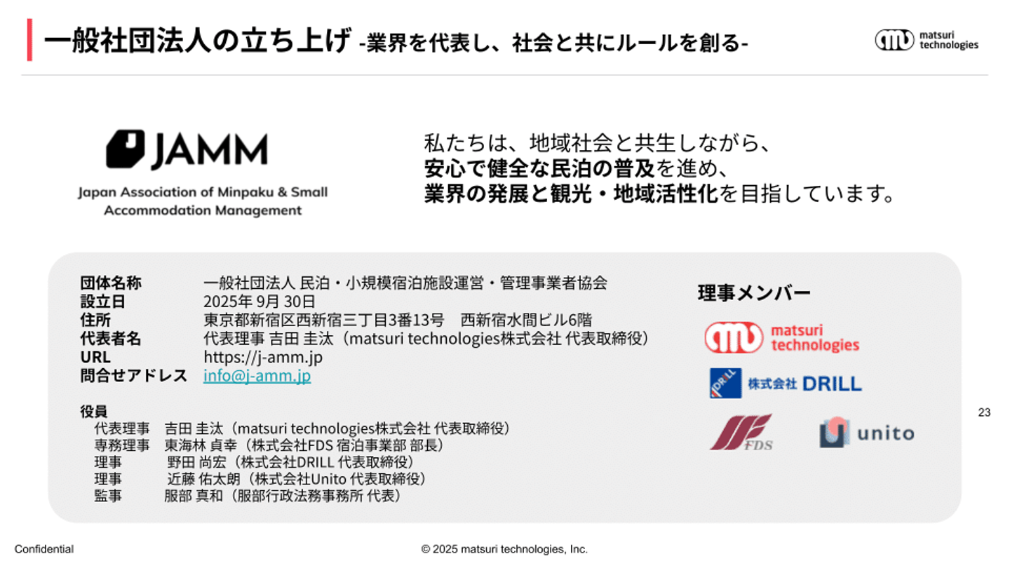 また、業界全体の健全な発展にも取り組んでいます。代表取締役の吉田が代表理事を務める一般社団法人を立ち上げ、業界と連携しながらルールづくりや地域・行政との連携にも取り組んでいます。