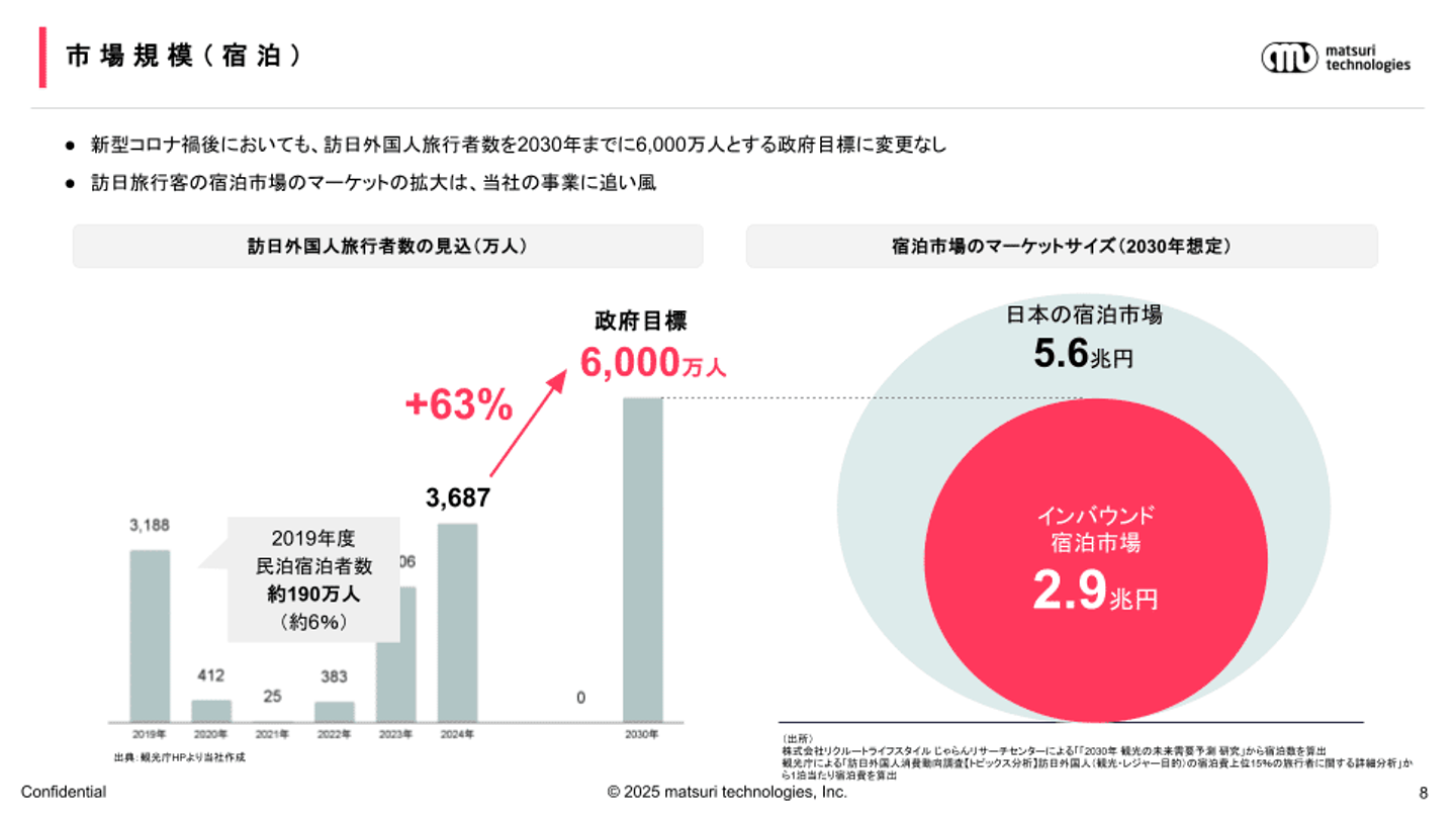 政府は2030年に訪日外国人旅行者数「6,000万人」を目標に掲げています。人の移動が増えれば、それに伴って宿泊や短期滞在の需要も増えていく。matsuriが向き合っているのは、そうした需要の高まりがある市場です。