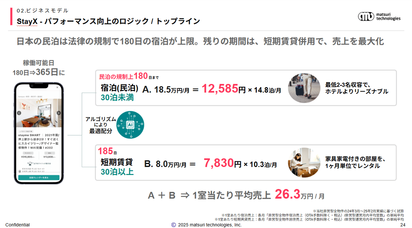 民泊には、制度上年間180日までという制約があります。そこでmatsuriは、宿泊だけでなくマンスリーマンションのような法人向けの短期賃貸を組み合わせることで、年間の稼働率を最大化しています。