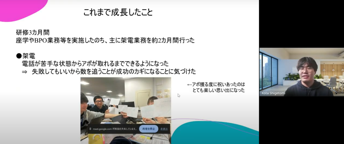 入社後3ヶ月の研修を経て、電話業務にチャレンジしました。最初は電話が苦手でしたが、数をこなすうちにアポが取れるようになり、「失敗を恐れず挑戦することの大切さ」を学びました。
