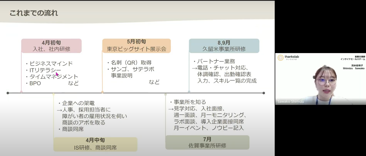 インサイドセールスでは、商談のアポ取得の為のテレアポを行い、同時に5月初旬に東京ビッグサイトで行われた展示会に参加したのち、佐賀の事業所での研修を行い、社会人としての基礎を学びました。