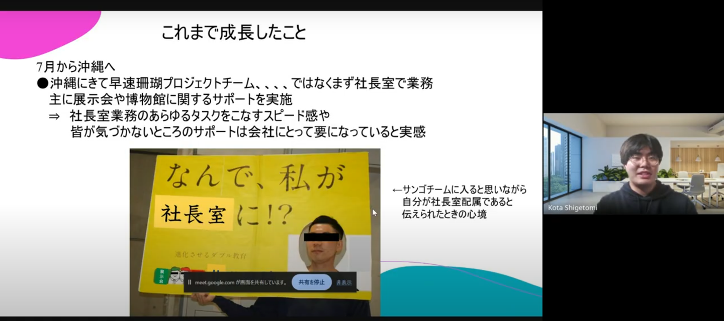 重冨さんの、電話業務から社長室業務・サンゴ保全まで、幅広い分野で成長していく姿に、