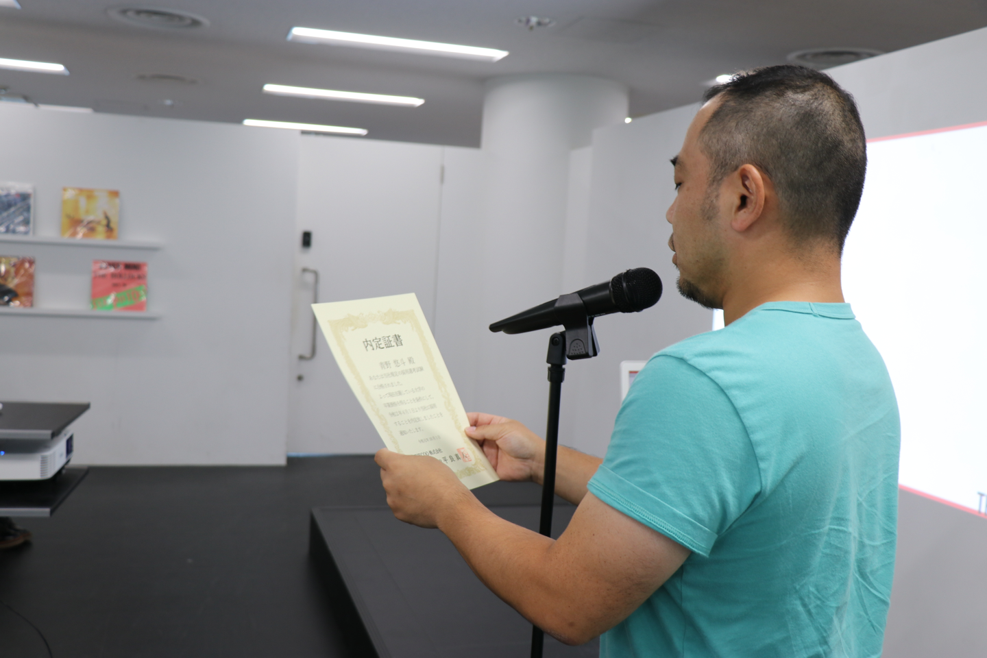 代表平良からの内定証書授与から始まり、役員からの祝辞と、社内では珍しい少し緊張感のある雰囲気の中、無事式は終了。
