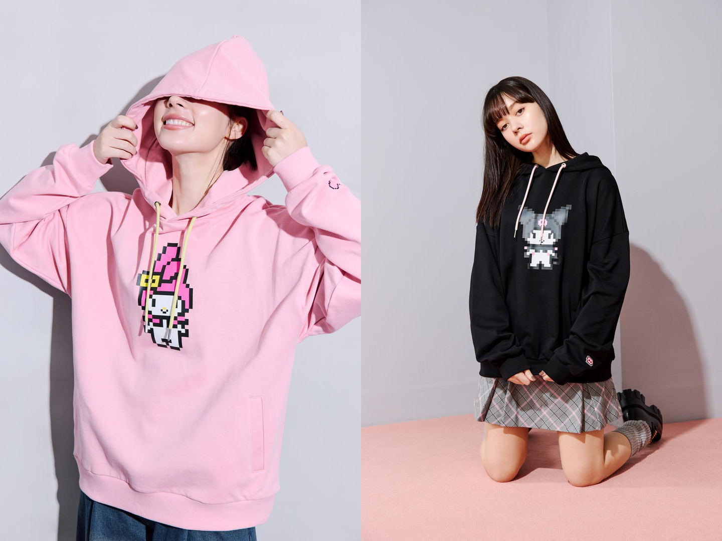 ハローキティ、マイメロディ、クロミを今期注目のピクセル柄に落とし込んだ遊び心満載!袖口のプリントも可愛いワンポイント。肌当たりの良いコットンで、しなやかでありながらハリがあり、着用シルエットもかわいいフーディーです。