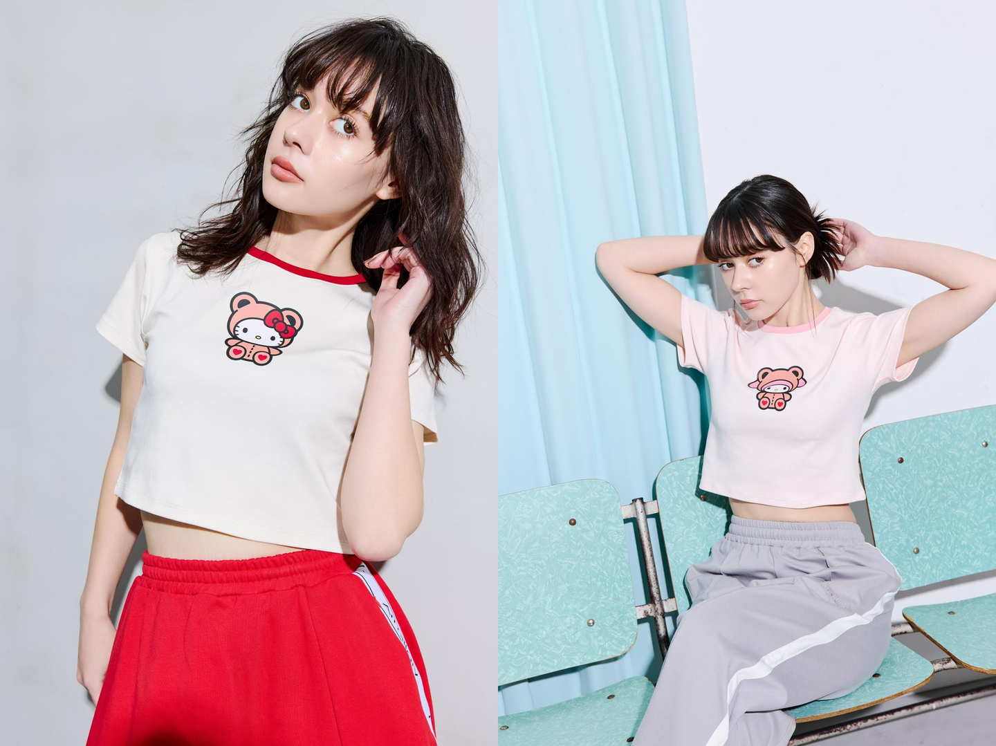 フロントにはハローキティ、マイメロディ、クロミがくまの着ぐるみを着たキャッチ—なプリント。程よく厚みがあり、どんなボトムとも合わせやすい短すぎないショート丈なので幅広いコーデをお楽しみいただけます。