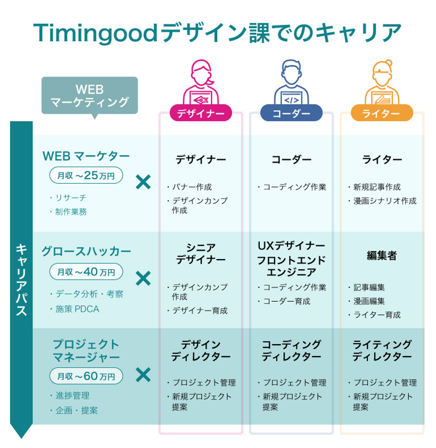 Timingoodのデザイナーが目指せるキャリアパスは、以下の通りです。