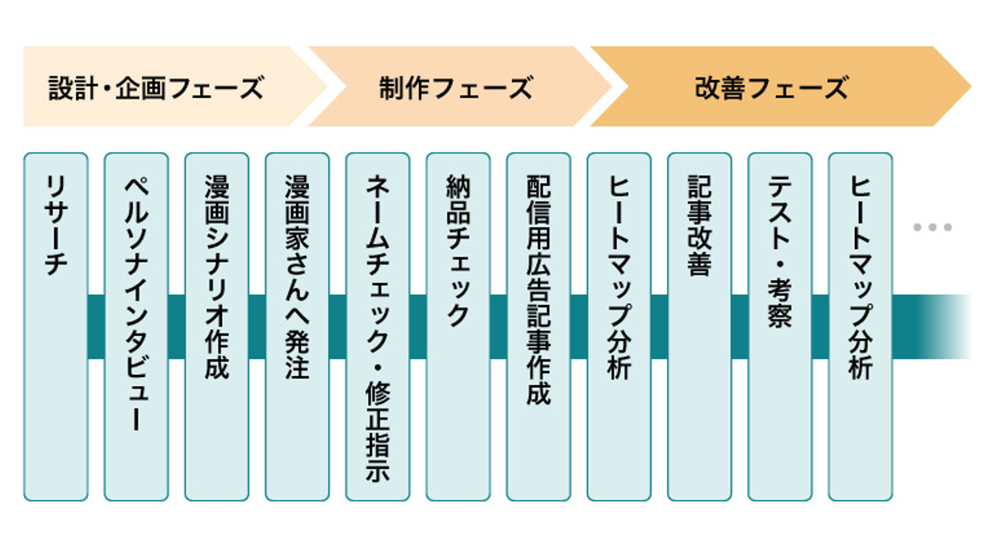 ・広告漫画制作クライアントのサービス・商品をわかりやすく伝えるために、シナリオ作成から漫画化まで約1ヶ月かけて完成させます。