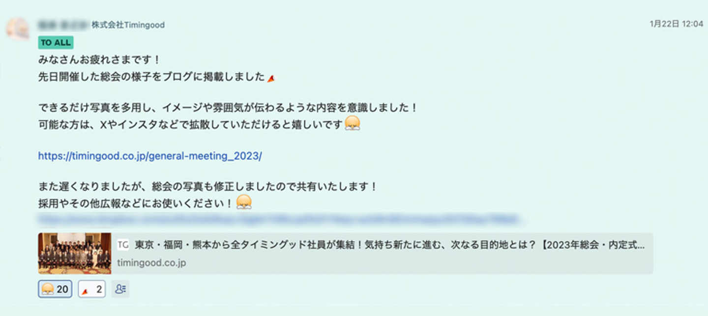 社内チャットに公開の報告をすると、みんな喜んで読んでくれるのでとても励みになります!↓