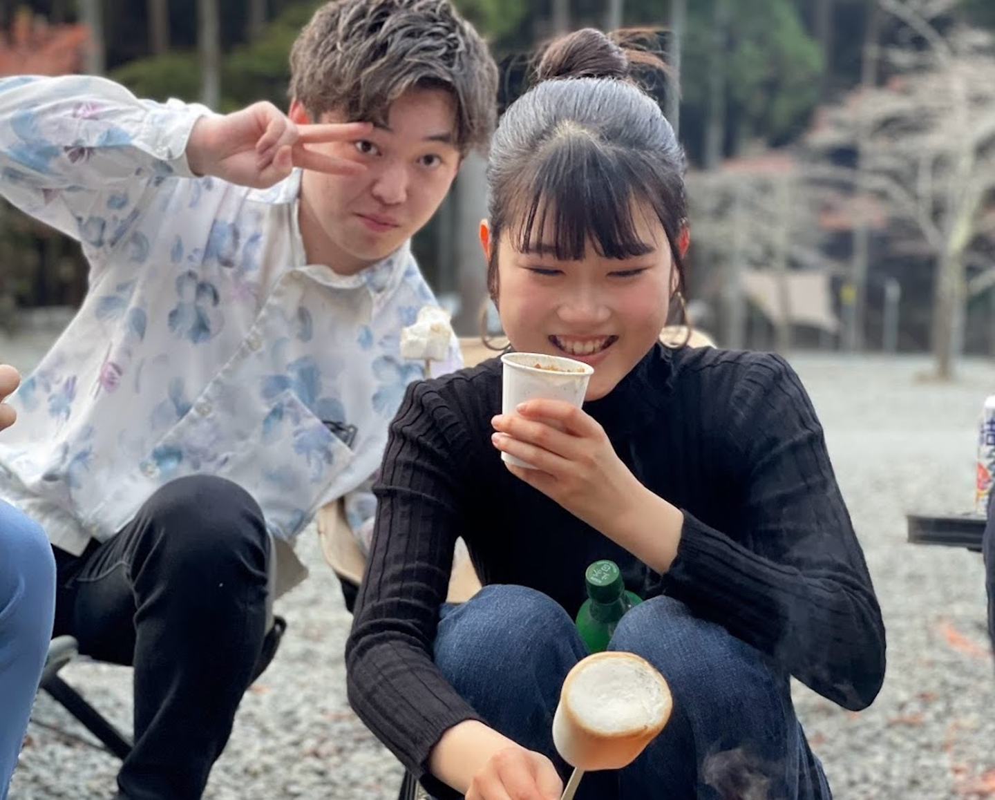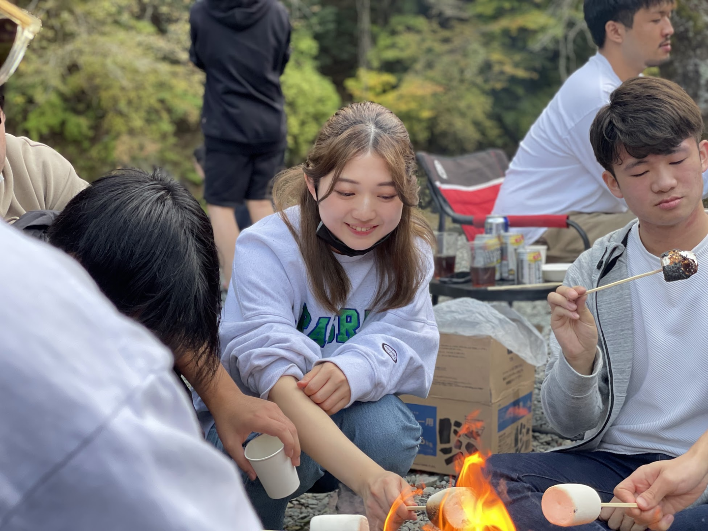 お肉と焼きそばをお腹いっぱい食べた後には、キャンプファイヤーを囲みながらみんなで団欒♪ 美味しそうなマシュマロ見て思わず笑みが溢れる営業部の三井田さん(真ん中)と、その隣で静かにマシュマロを大焦げさせる講師のたけ先生(右)。