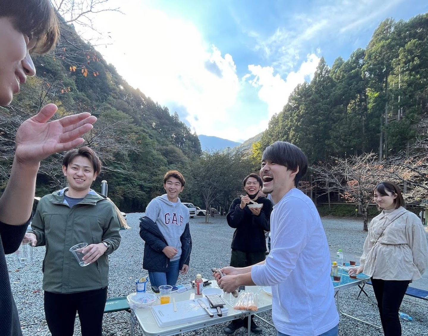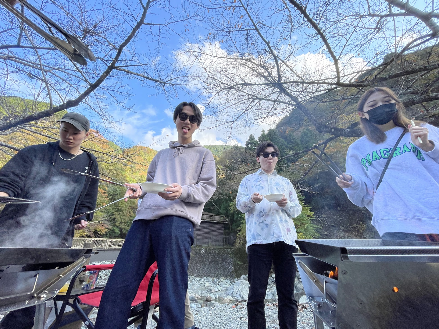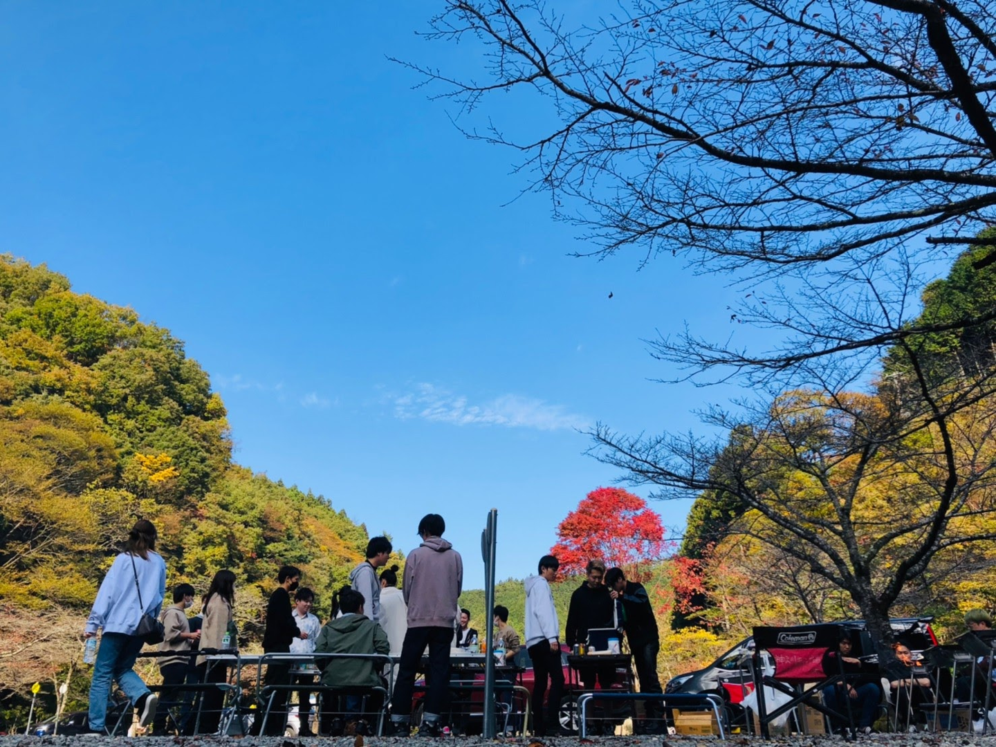 数々の誘惑に打ち勝ち(?)、いよいよ神之川キャンプ場に到着。秋の冷たい空気がほどよく心地良い、まさに最高のBBQ日和となりました。都会の喧騒から遠ざかり、ゆったりとした時間をいざ満喫!
