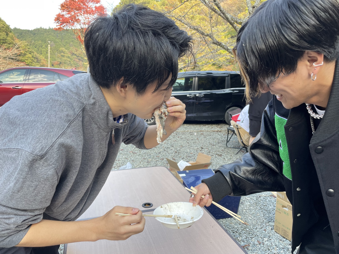 川で釣りをしているおじいさんから、マスのお裾分けをいただきました✨川の魚をその場で焼いて食べる営業部の板橋マネージャー(右)と、講師の植田先生(左)。ワイルドなランチになりました😎