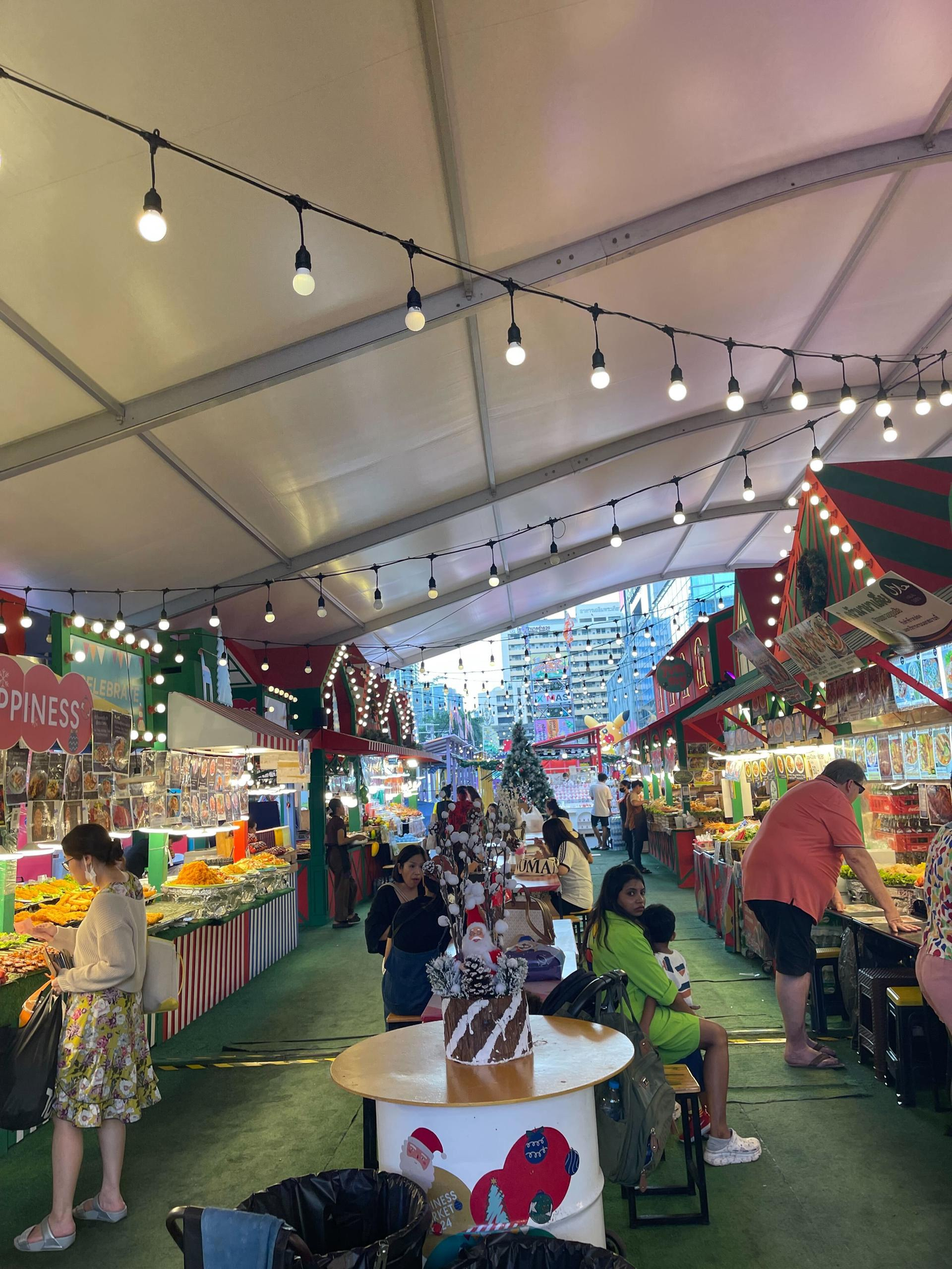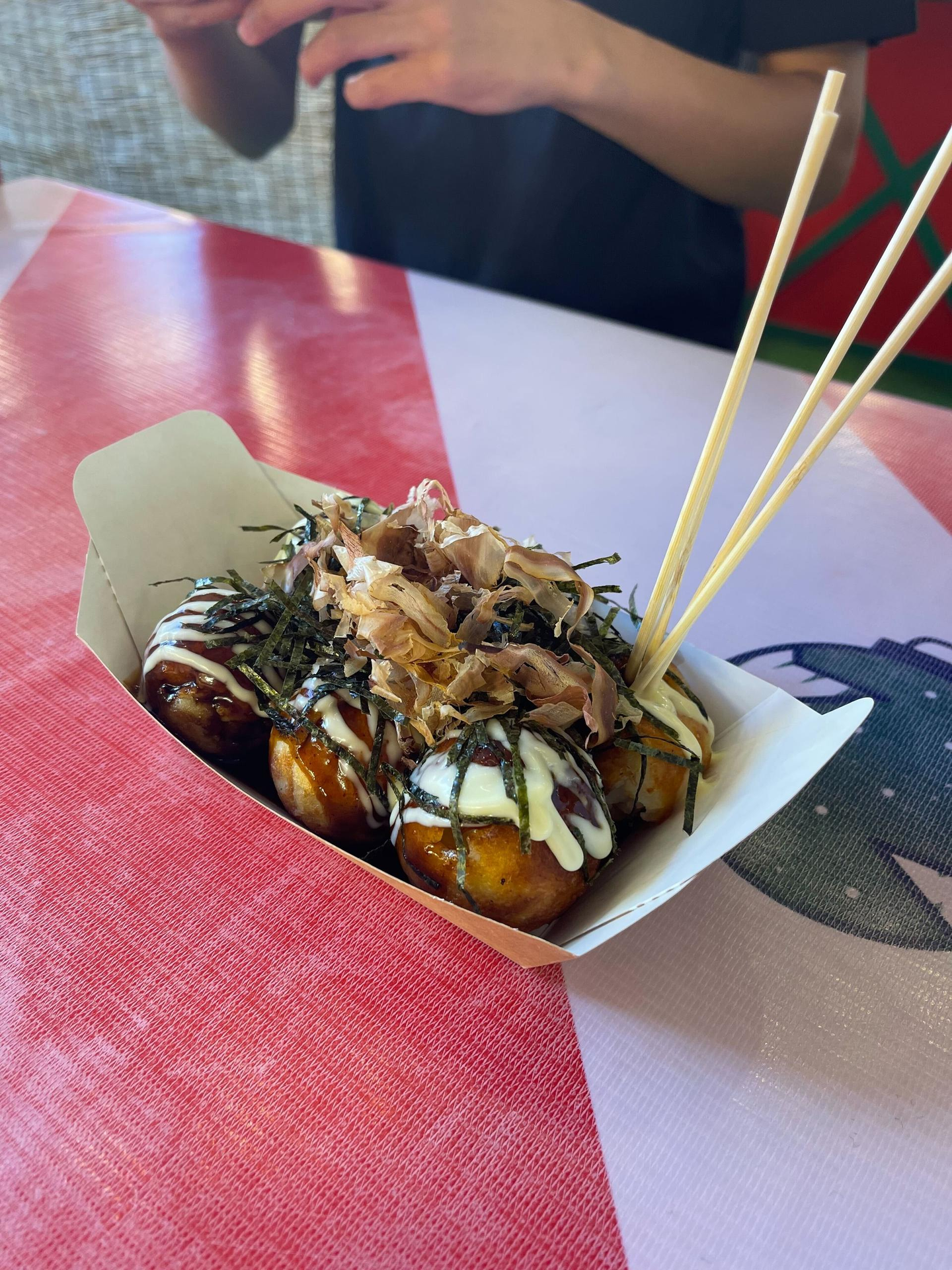 カンファレンス後は、ホテルに戻る前にアキラさんカズキさんと軽食。真夏のクリスマスマーケットで、たこ焼きを食べました。