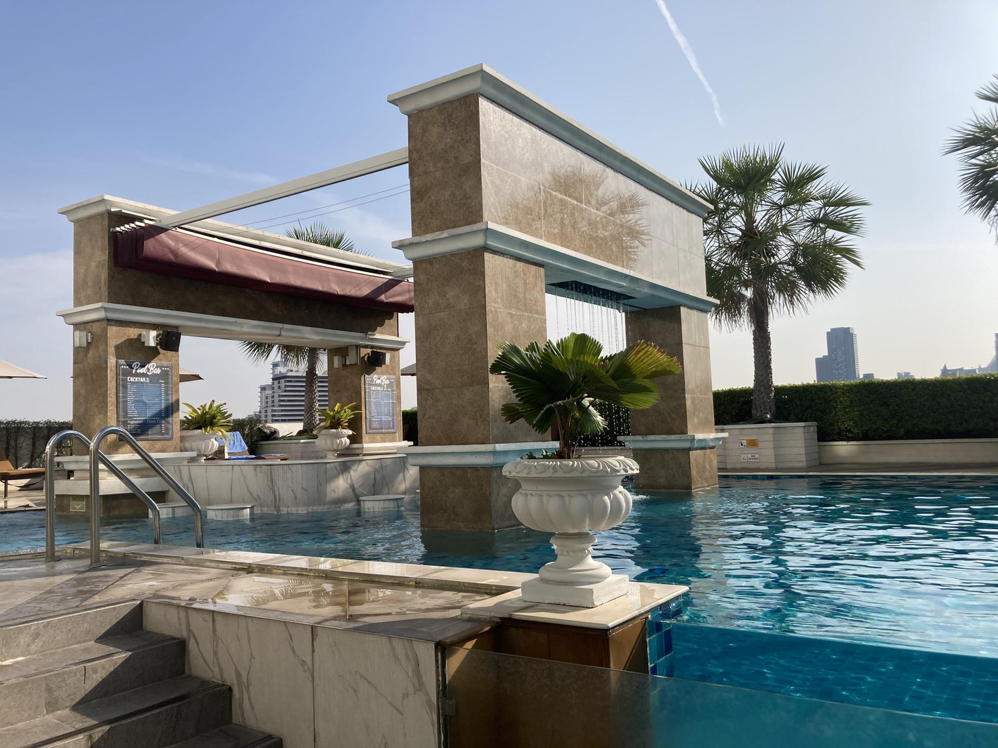 毎朝の恒例となったホテル併設ジムでの筋トレ(毎日ソウイチロウさんとやってました)を終えた後、ジム横のプールに移動し、綺麗な景色を眺めながら研修期間の振り返りを行いました。(優雅な時間~)