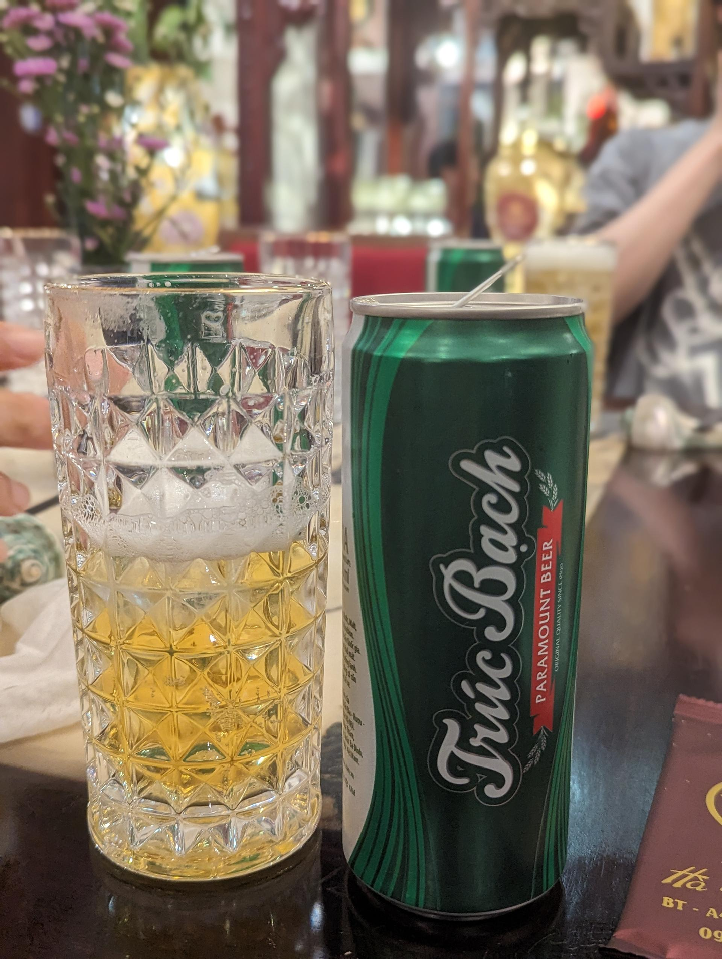 あとこれは過ごしていくうちに分かったのですが、ベトナムって飲み物をあまり冷蔵庫で冷やす習慣がないんですかね。どのお店に行っても、缶ビールは常温でグラスに氷を入れて飲むスタイルが主流でした。