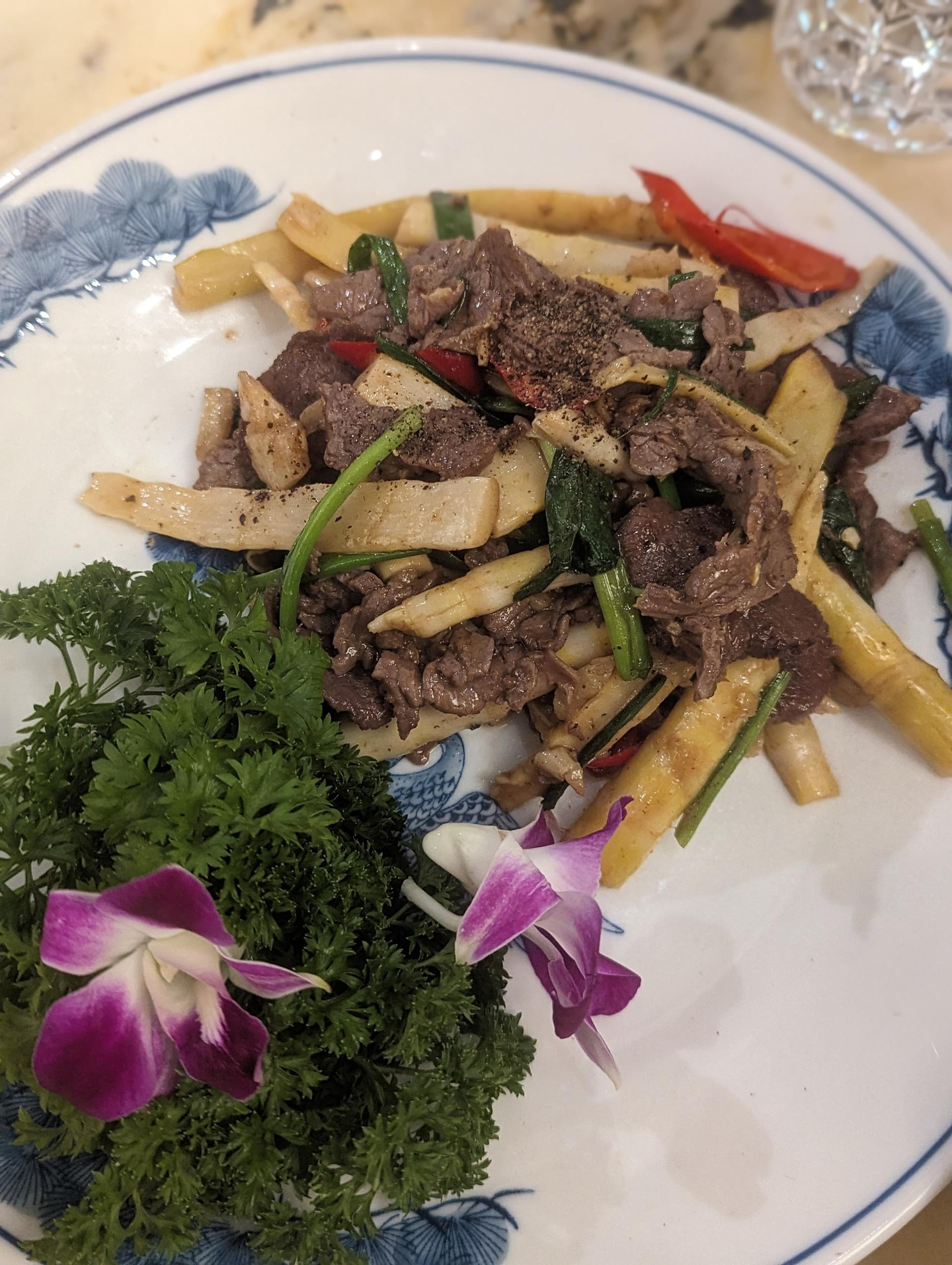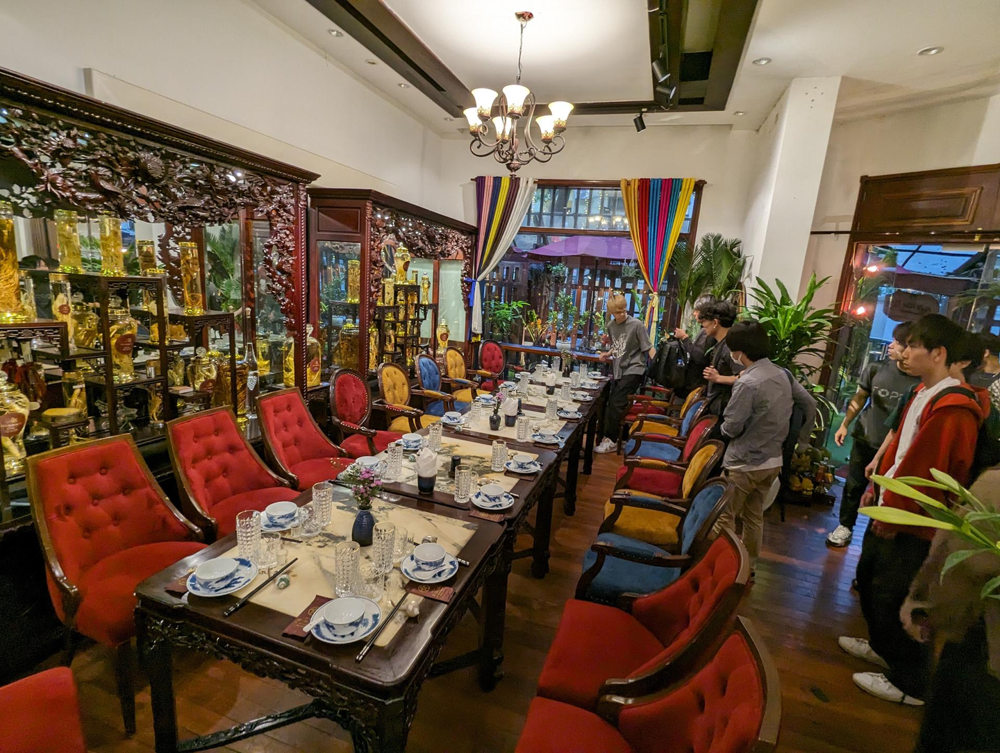 お店は緑に溢れた綺麗な外観で、中に入るとすごく高級そうなテーブルや椅子が並び、それにベトナムの伝統っぽい装飾が施されたインテリアでした。