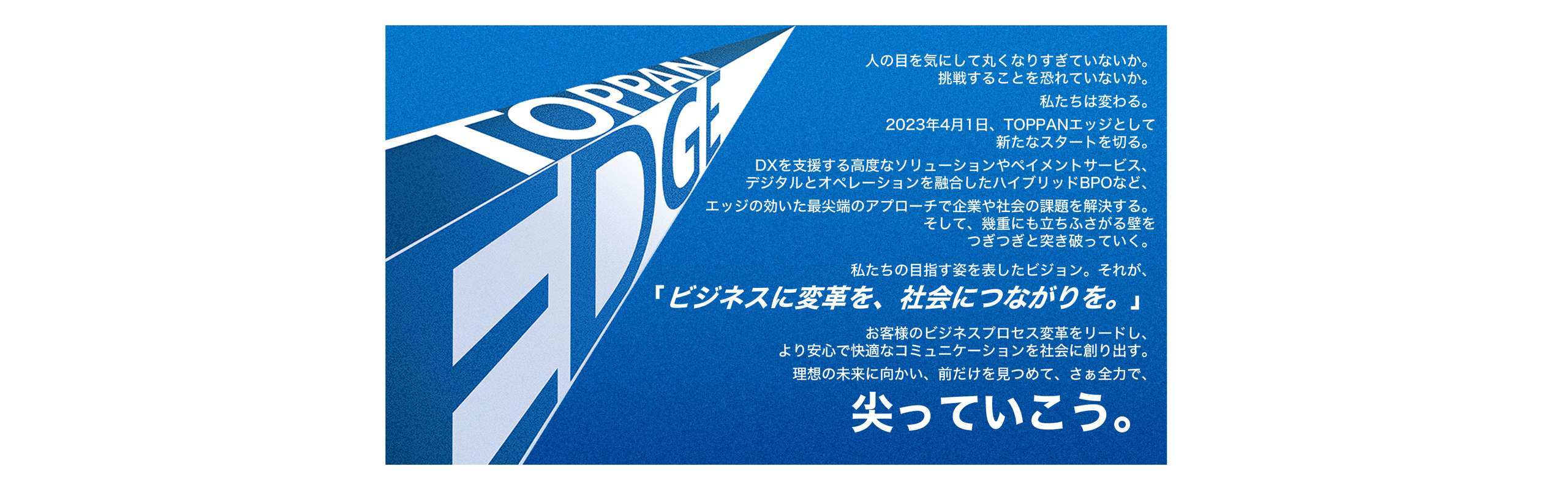 TOPPANエッジは2023年4月、凸版印刷 セキュア事業部とトッパン・フォームズの事業統合により生まれた新会社です。 印刷テクノロジーを通じて、社会の「信頼」を支えてきたトッパングループ。 グループの事業ポートフォリオの強化を目指して新たにスタートを切りました。 DXソリューションやペイメントサービス、デジタルとオペレーションを融合したハイブリッドBPOなど、 両社の強みを融合した最尖端のアプローチを通じて、お客様のビジネスプロセス改革をリードし、より安心で快適なコミュニケーションを創出します。