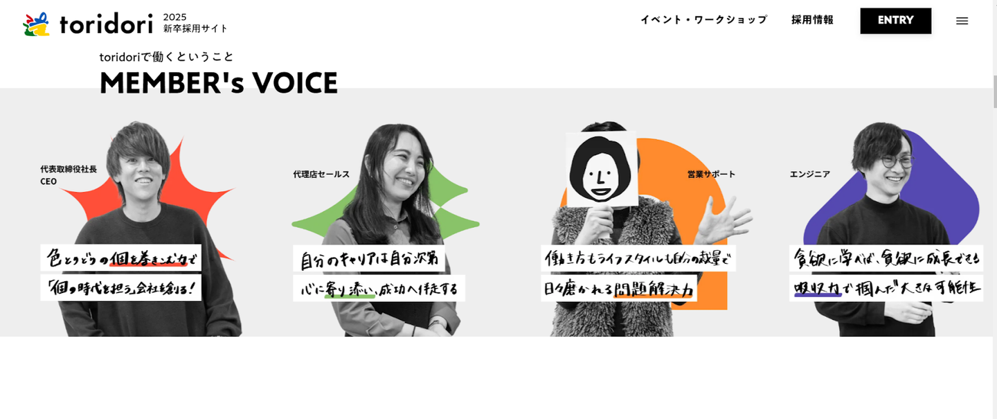 今回の新卒採用サイト作成では、toridoriが提供できる価値についてさらに深掘りするため、社内の全メンバーに「toridoriに対してどのような思いを抱いているか」というアンケートを実施しました。その回答から共通項を見つけ出して、今回の採用テーマ「なりたい自分に、やりたい仕事で」を決めました。新卒サイトを見て、「こういう社会人、こういう大人になりたい!」と思ったら、ぜひtoridoriにご興味を持っていただければ幸いです。
