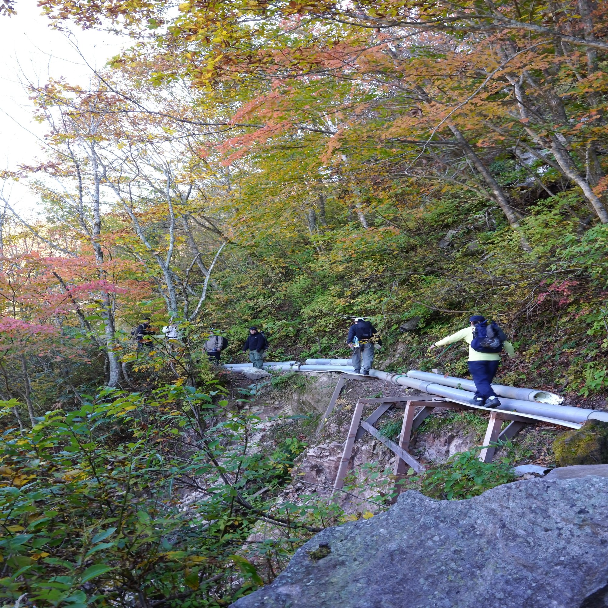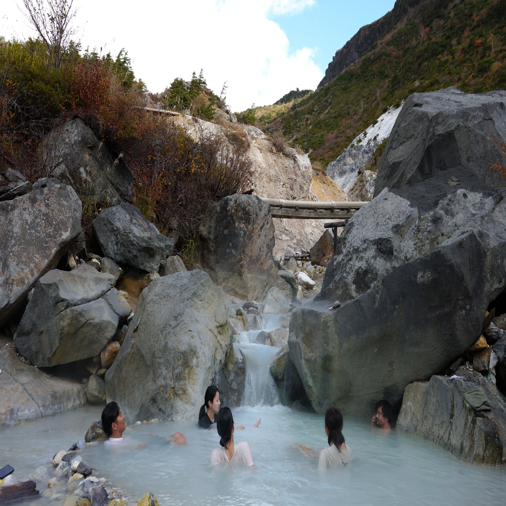 この上にも温泉スポットがあり、そこを目指して薄着で冒険するメンバーも。