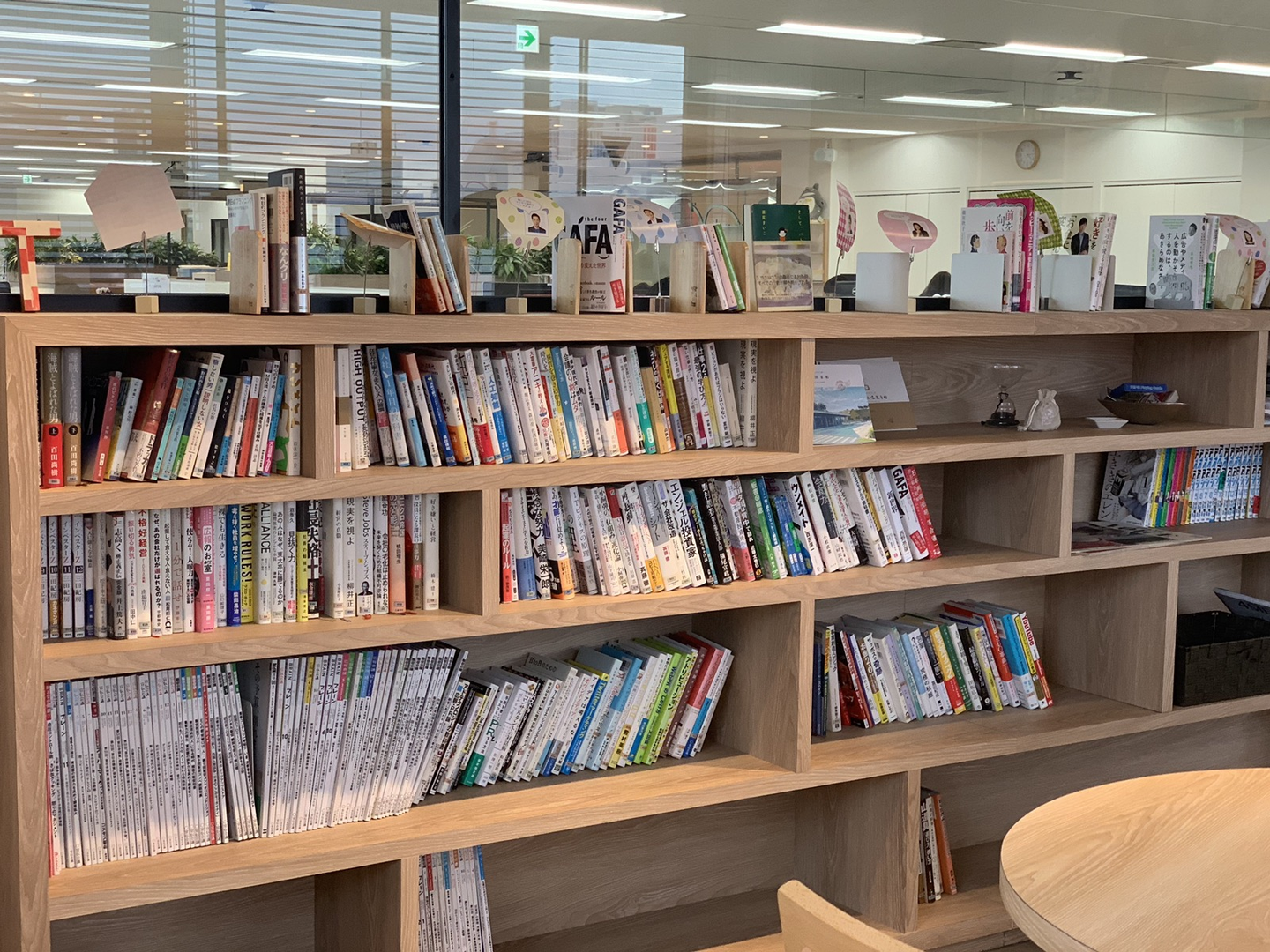 経営メンバーが読んでいた本や、社員のおすすめの本がジャンル問わず沢山置いてあります。
