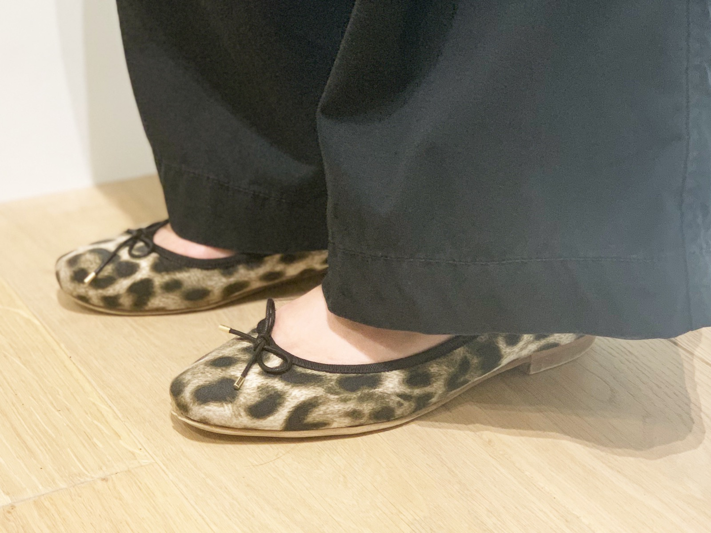 足元はヒョウ柄のぺったんこ靴。