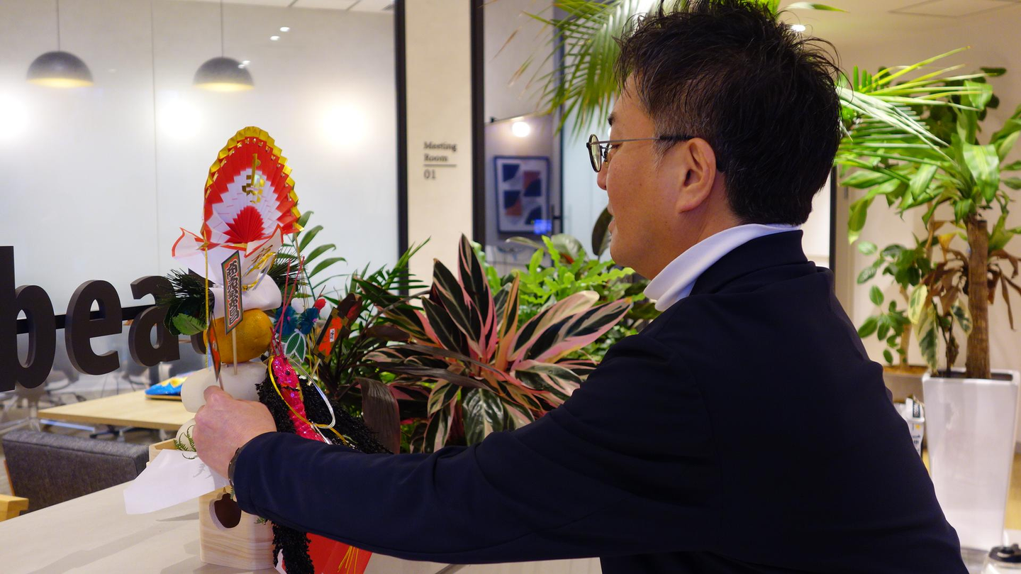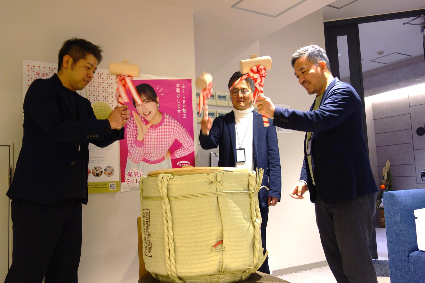 佐藤会長、橋本社長、長山CFOの3名による景気の良い鏡開き! 晴れやかな笑顔と威勢のいい音に包まれ、納会の始まりです🎊