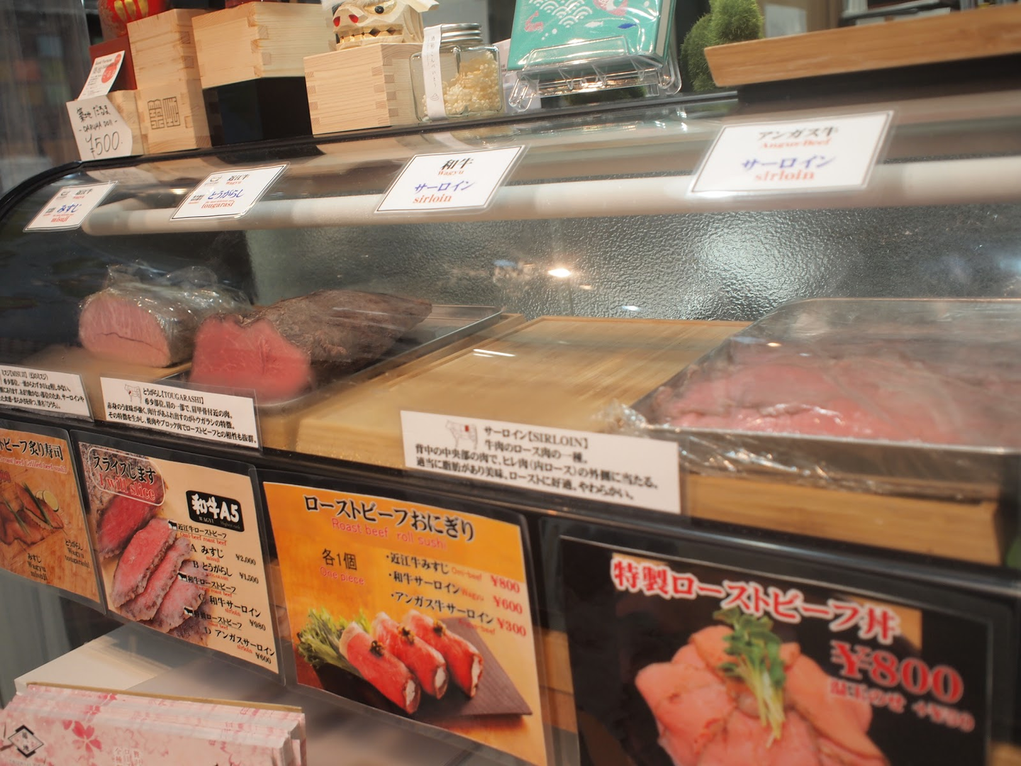 左から"サーロイン(ニラのたれ)"300円、"トウガラシ(柚子胡椒)"600円、"みすじ(もろ味噌)"800円の肉巻きおにぎりです。
