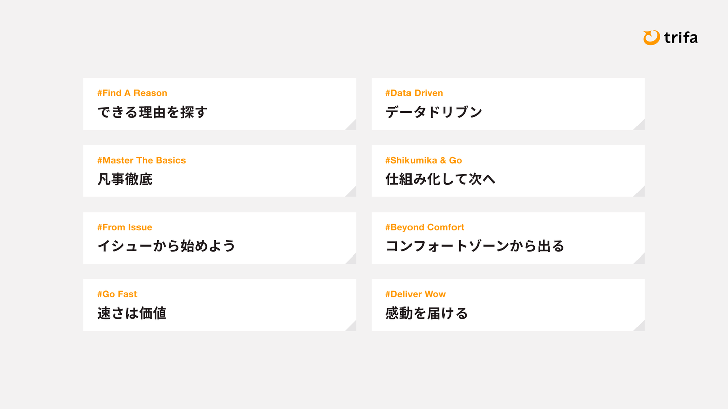 MVV(ミッション・ビジョン・バリュー)を日々の行動から体現していくために、現在ERAKEに根付いてきている組織文化やこれから目指してきている組織文化を言語化しています。