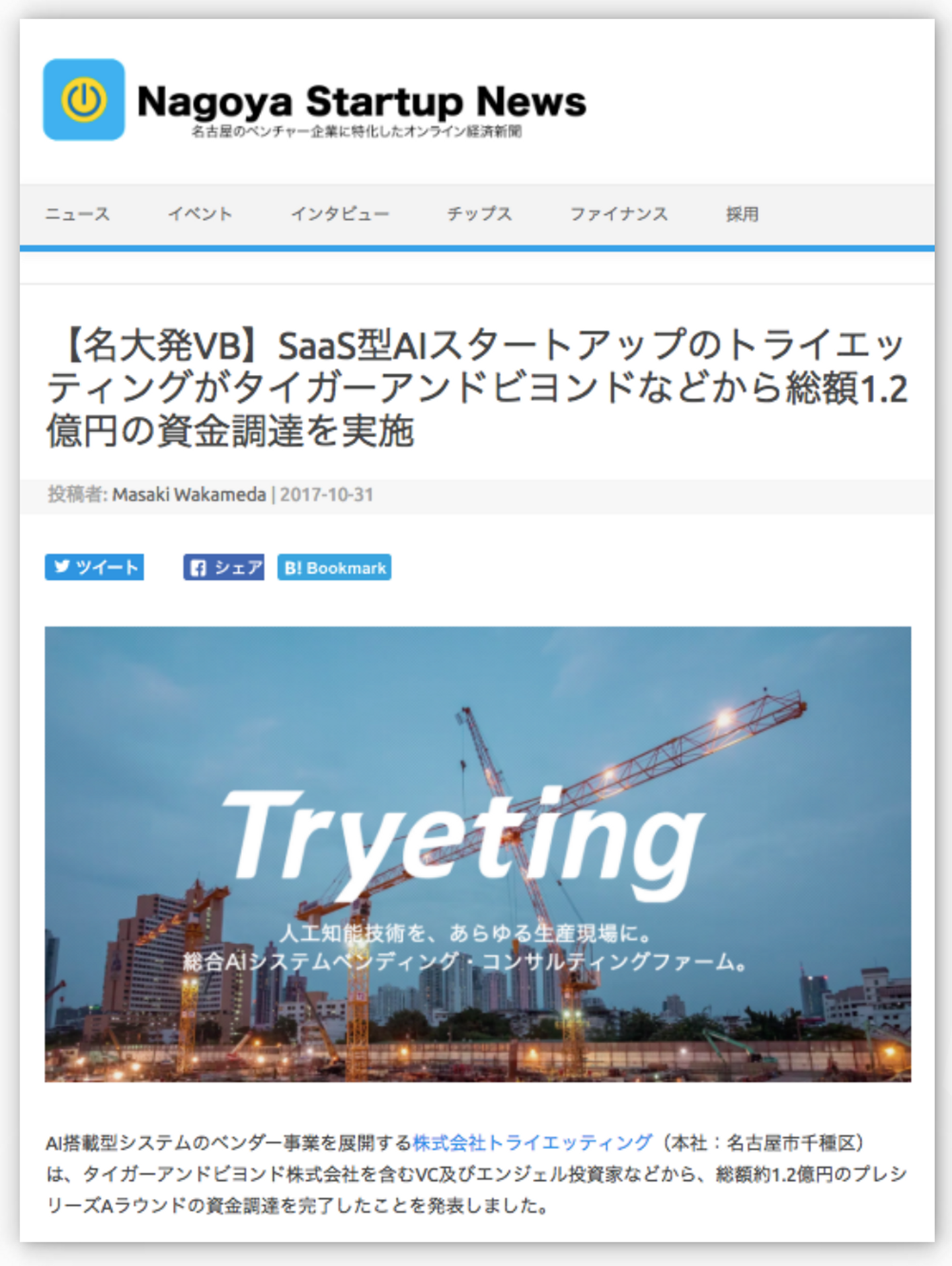 (記事:Nagoya Startup News「【名大発VB】SaaS型AIスタートアップのトライエッティングがタイガーアンドビヨンドなどから総額1.2億円の資金調達を実施」)
