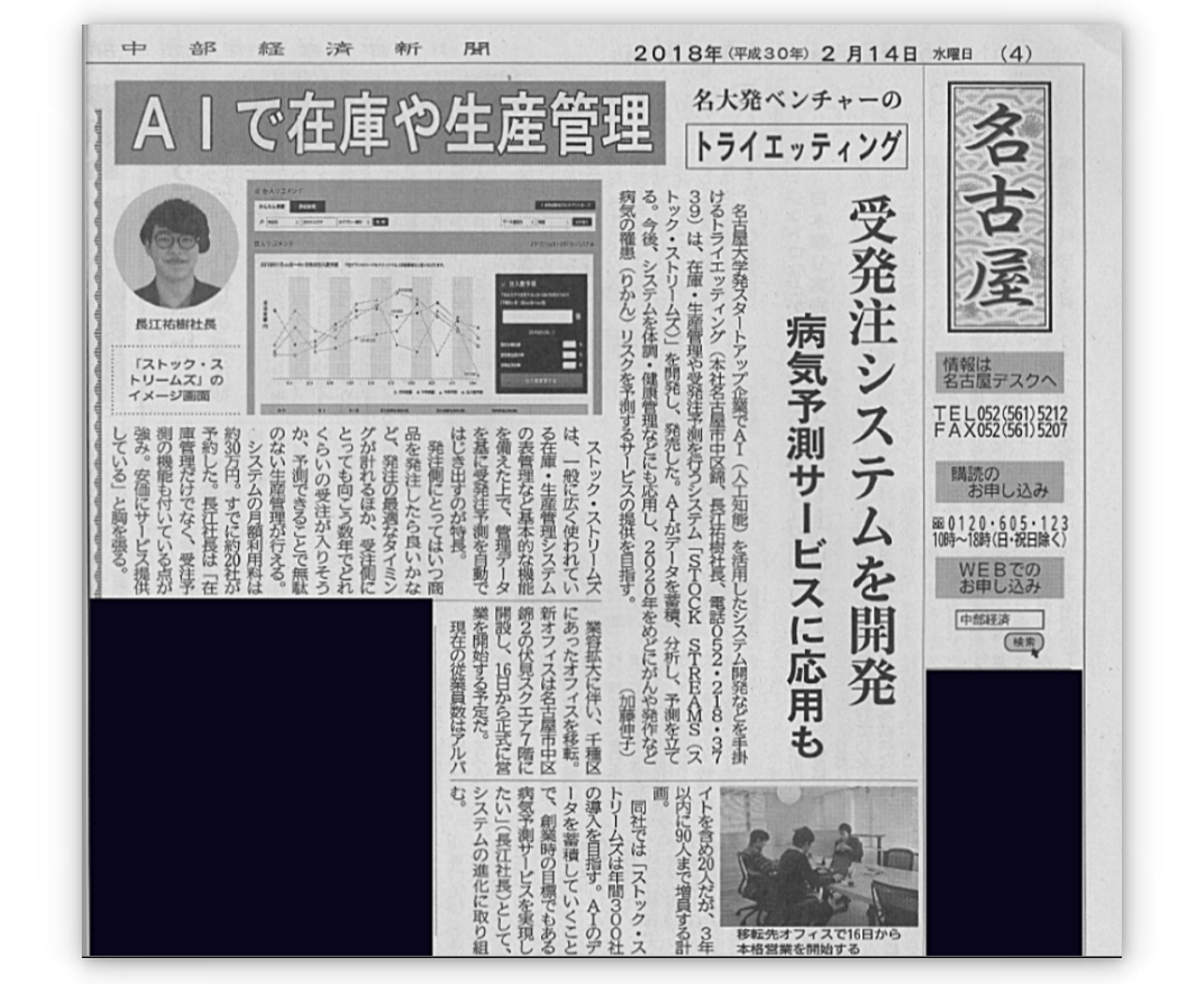 名古屋大学の近くにあった本山オフィスを、現在のオフィスに移転しました。このタイミングでプレオープンしていた在庫・生産管理AI「STOCK STREAMS (ストックストリームズ)」と共に中部経済新聞様に取材をして頂きました。