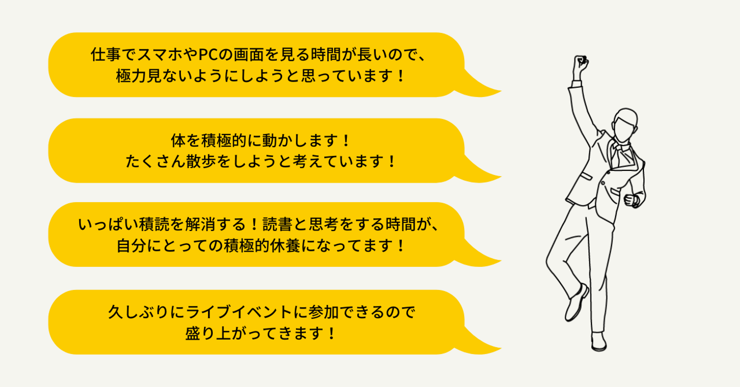 GW中は、デジタルデトックスを行ったり、運動をしたりして心身ともにリフレッシュするという声が多く聞かれました。自分に適した方法で休養を行う予定だとのことです!