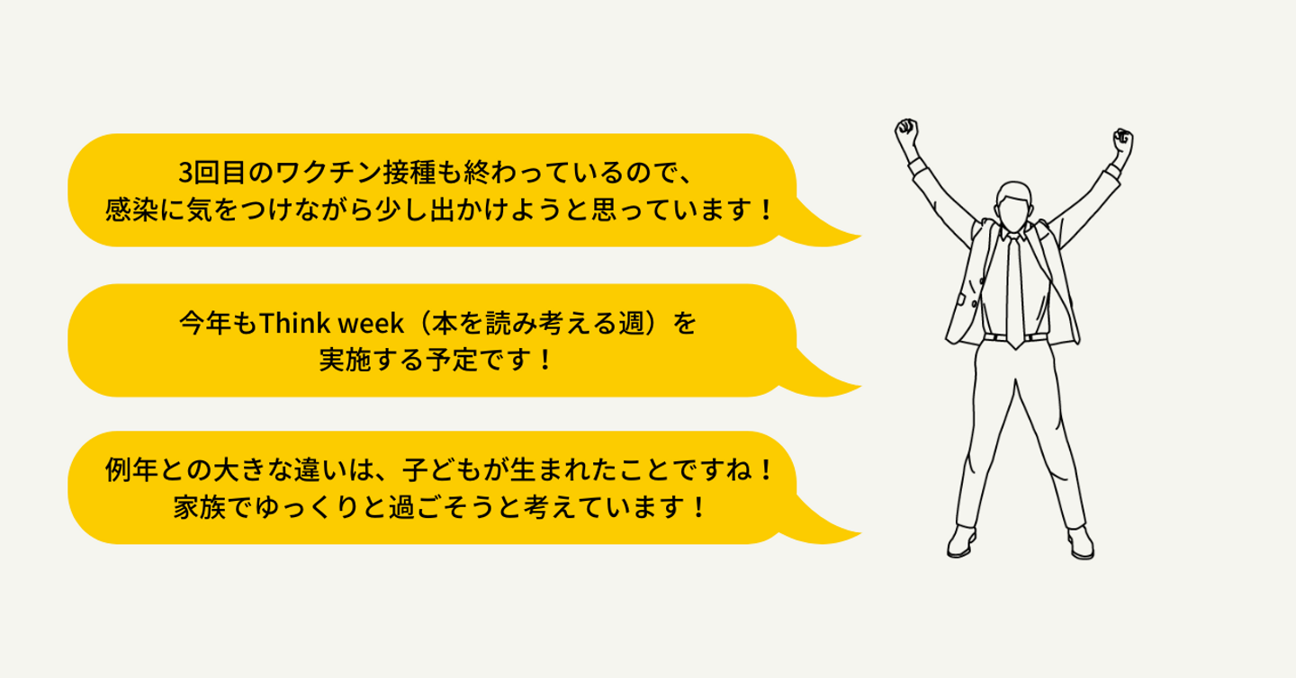 また、弊社では昨年お子さんが生まれた社員が多いことから、例年との大きな違いは感染拡大よりも子どもの存在だという声も挙がりました。GWは家族でゆっくり過ごしたいなと話しています。