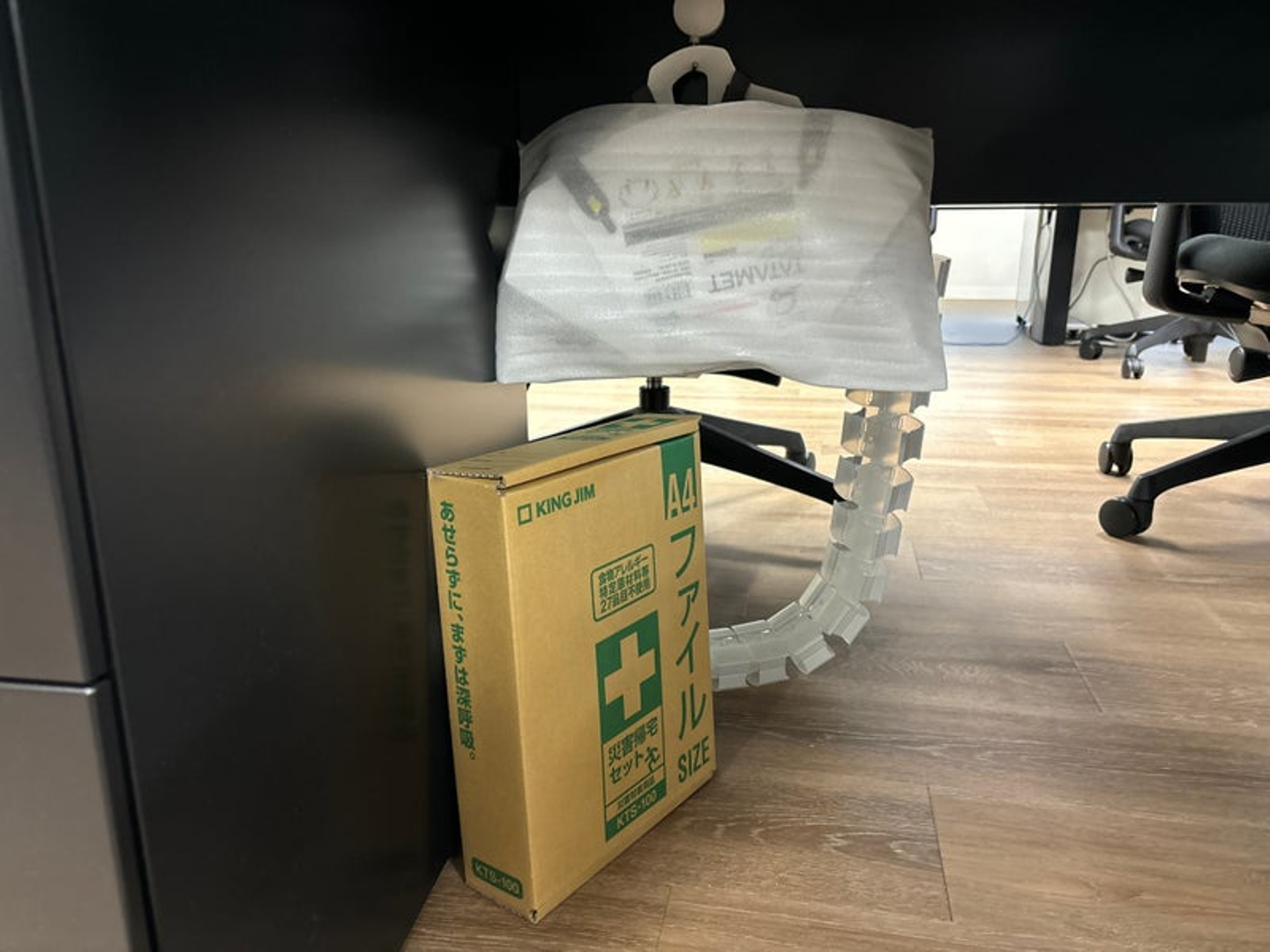 災害時帰宅セット(アルミ毛布、笛、飲料水など)とヘルメットを、個々人のオフィスのデスクの足元に備え付けています。