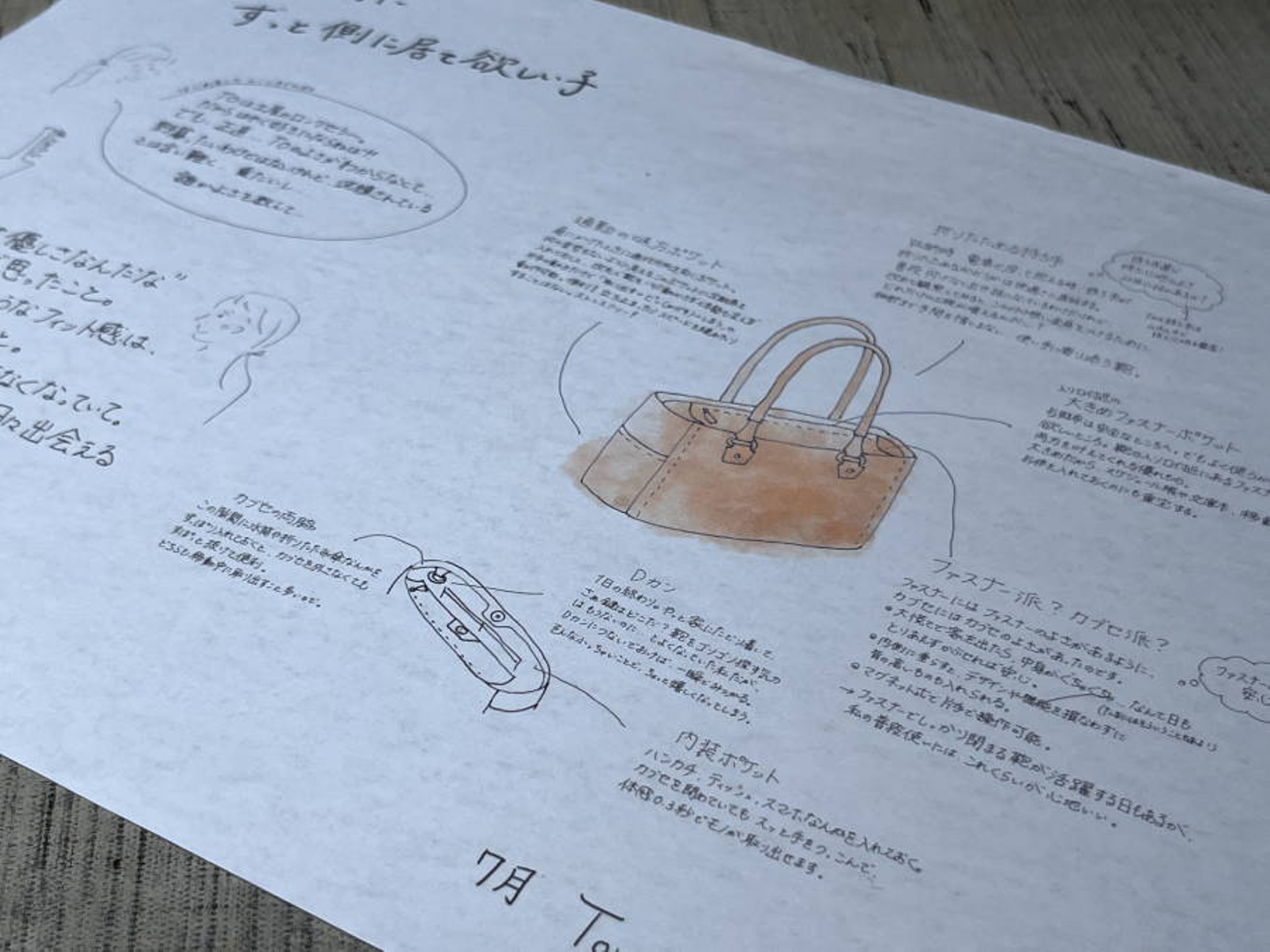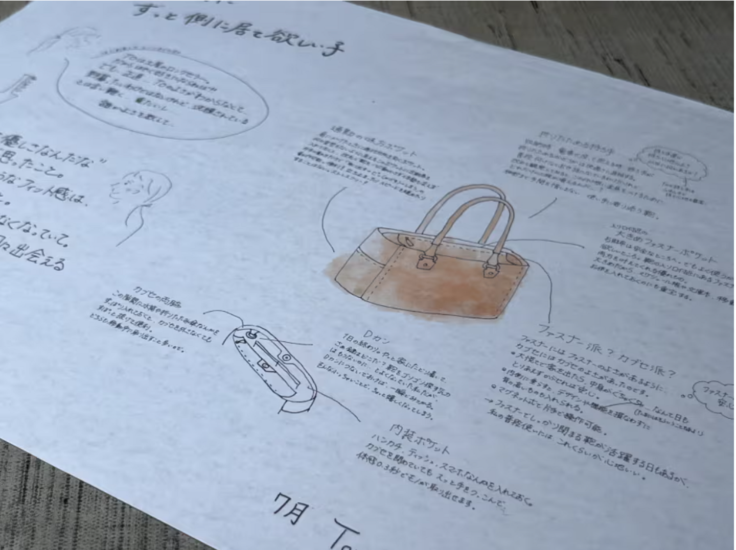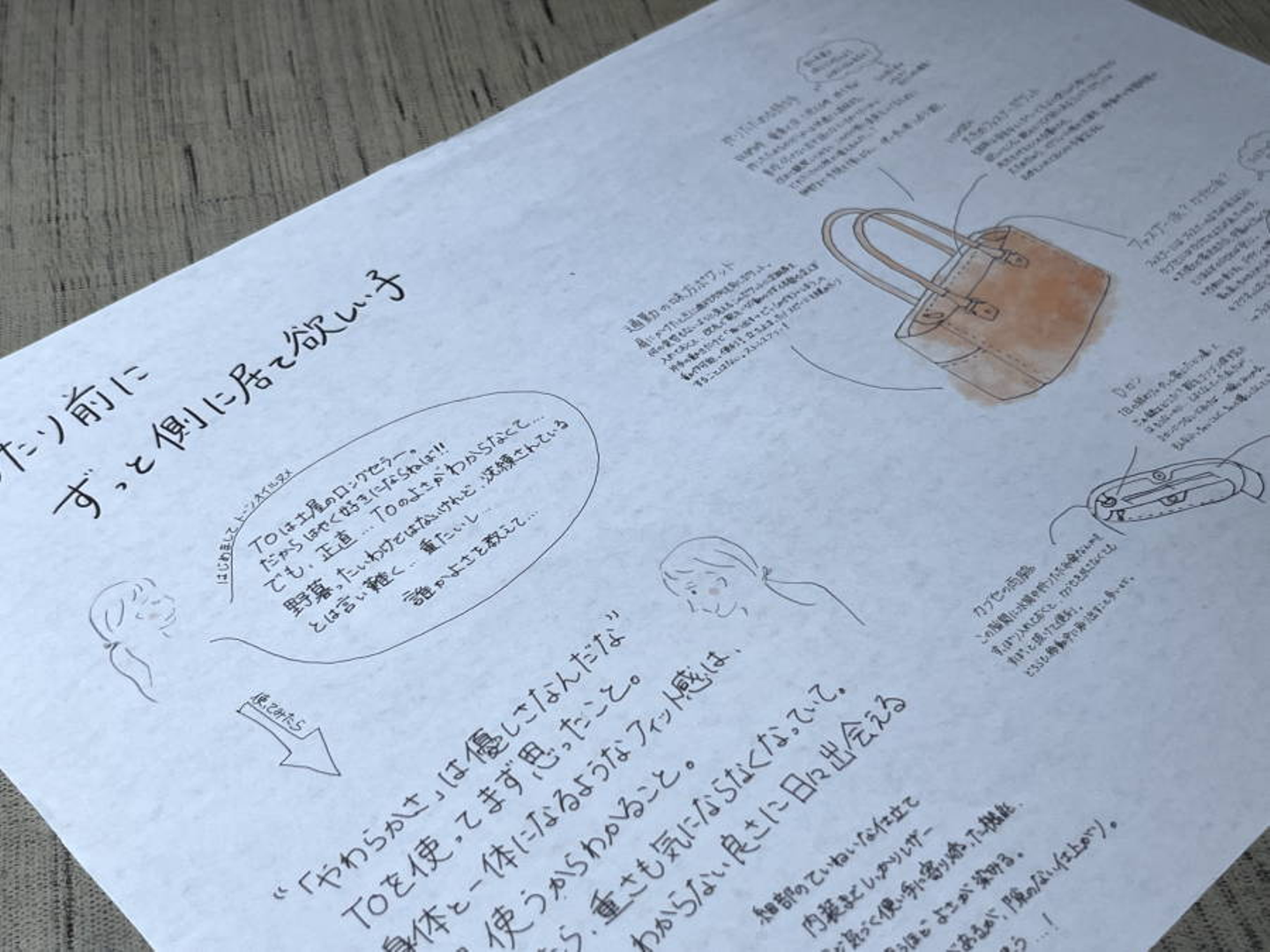 例えば、ポケットの数や持ち手の仕様など。実際に使ってみたからこそ分かる、製品の良さがありました。生活する上で必要なデザインが、この鞄に備わっている。そのことを自分の手でレポートとしてまとめたことで気付けたんです。