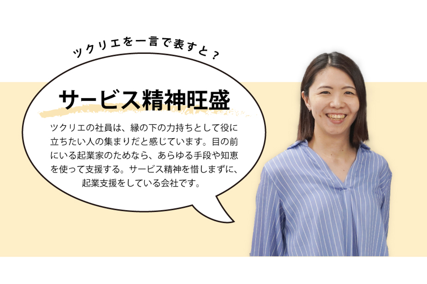 ツクリエの社員は、縁の下の力持ちとして役に立ちたい人の集まりだと感じています。目の前にいる起業家のためなら、あらゆる手段や知恵を使って支援する。サービス精神を惜しまずに、起業支援をしている会社です。