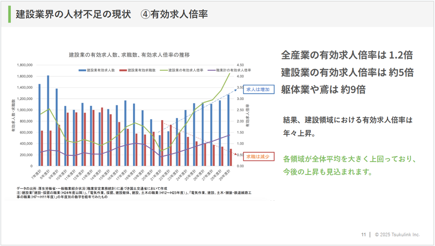 慢性的な人手不足に悩まされる建設業界。人口減少している国内の中でも現場作業従事者や大工、職人など技能者の入職者数は減り続け、他産業と比べても顕著に少子高齢化が加速しています。一方で、都市開発やインフラ整備など建設投資額は増加傾向にあるため、有効求人倍率も右肩上がりに上昇しており、各社が人手を競い奪い合っている状態と言えます。