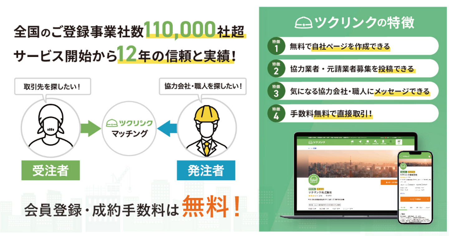 ツクリンクでは現在、登録事業者数が11万社を超え、さまざまな業種・地域・規模の事業者が、協力会社や元請先との新しい繋がりを日々築いています。 これまでは出会えなかった事業者同士が、信頼性を担保しながらオンラインで新たな関係性を築く──そんな事例が数多く生まれています。