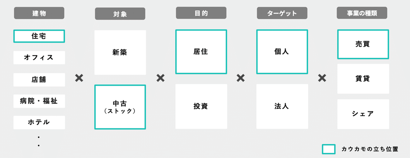 不動産業界は建物の種類やターゲット、事業のタッチポイントなどで様々な領域がありますが、ツクルバは主に「リノベーション住宅を中心とした、中古住宅の売買」の領域で事業を行っています。