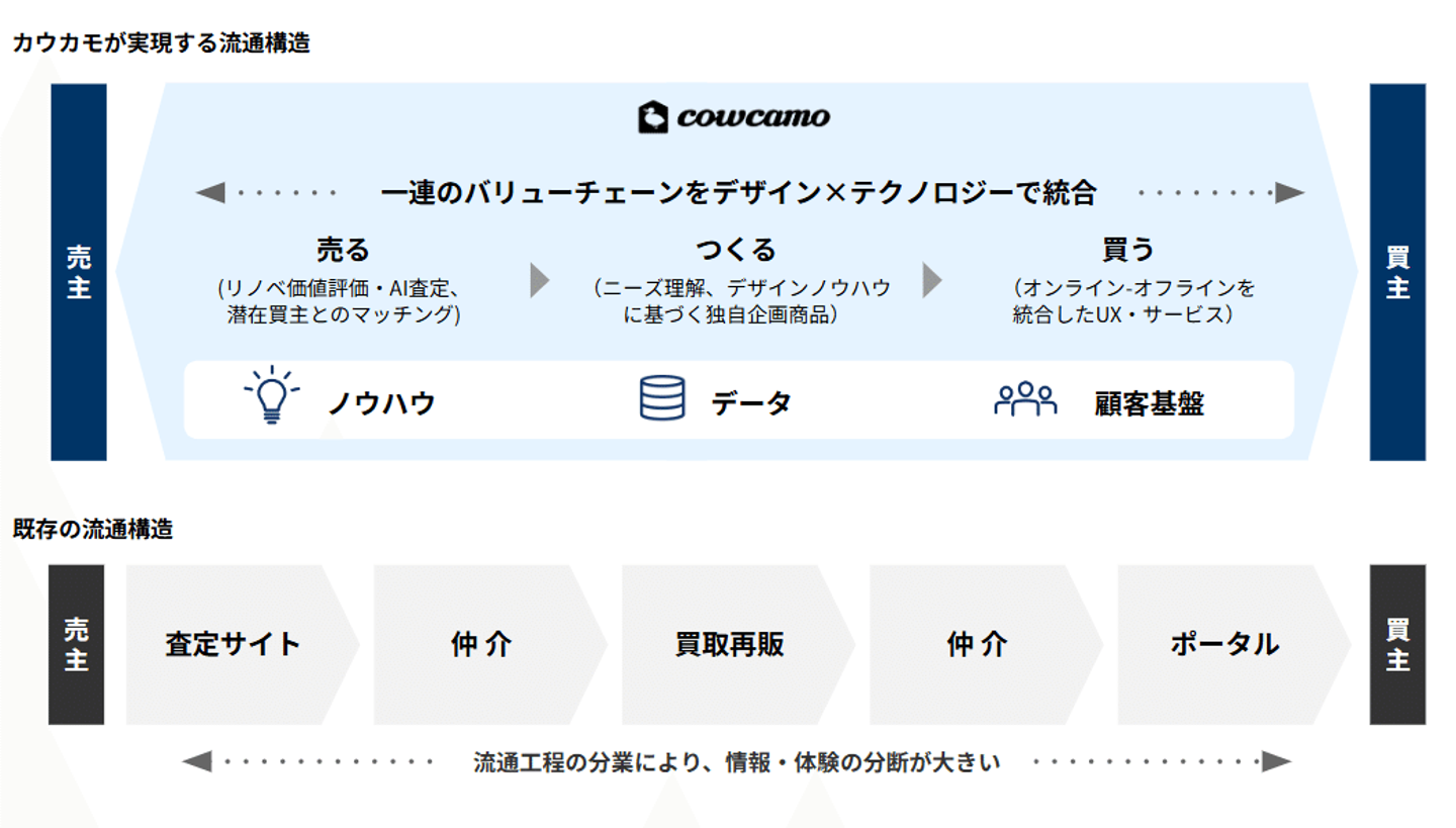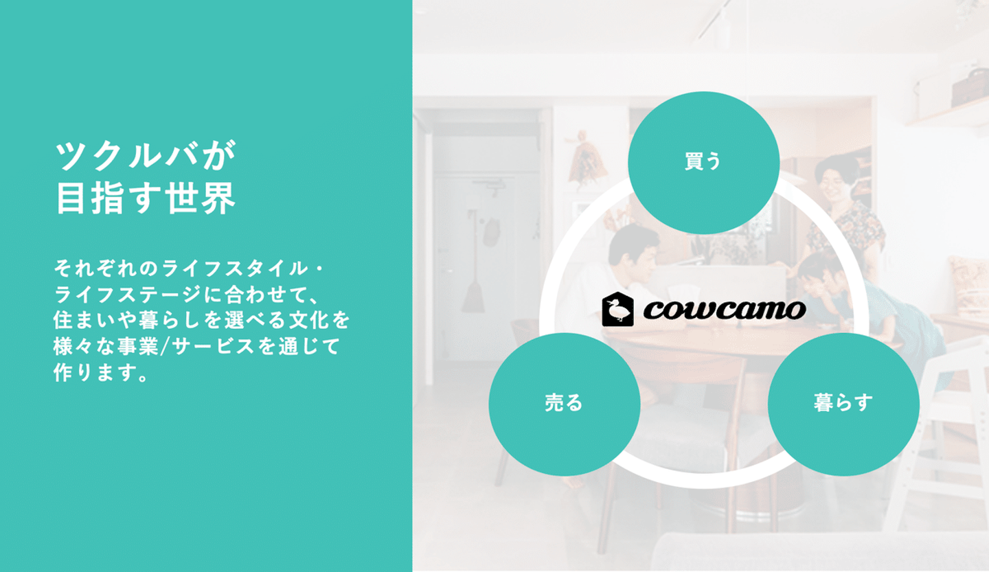 理想の暮らしを実現するための中古・リノベーション住宅の流通プラットフォーム(cowcamo)の運営やエージェントによるカスタマーサービスなどを行う事業。