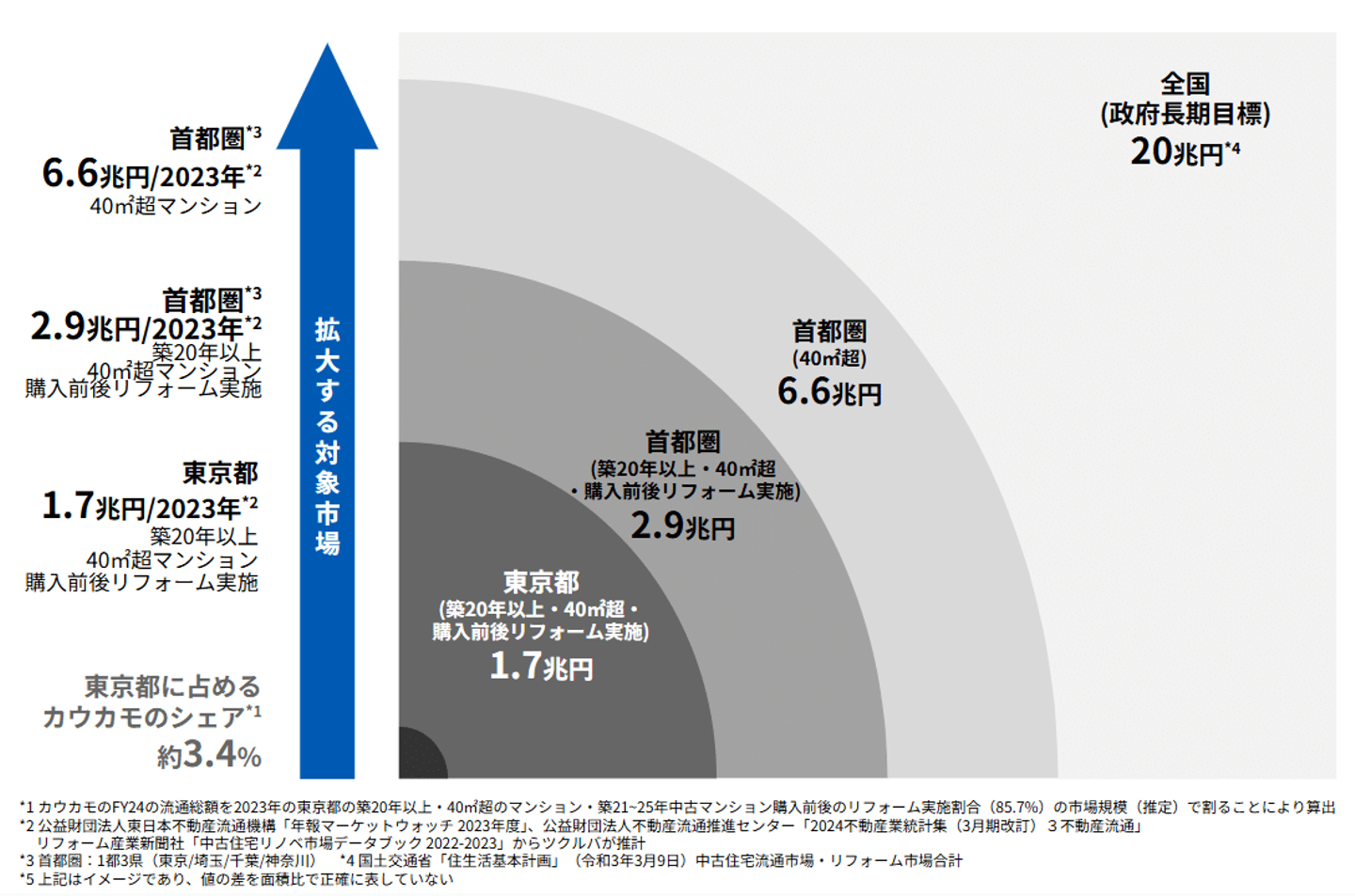 以下のグラフからも分かる通り、中古・リノベーションの市場規模はこれからもどんどん大きくなることが想定されています。国の調べでは、市場は今後全国20兆円規模に成長すると試算されています。私たちは現在一都三県の中古マンションを中心に取り扱っていますが、中でも物件数の多い東京都に占めるシェアは3.4%と、これからさらにシェアを拡大していく余地があります。また、都内にとどまらず全国にも拡大させることができるため、市場のポテンシャルが非常に高いことが特徴です。