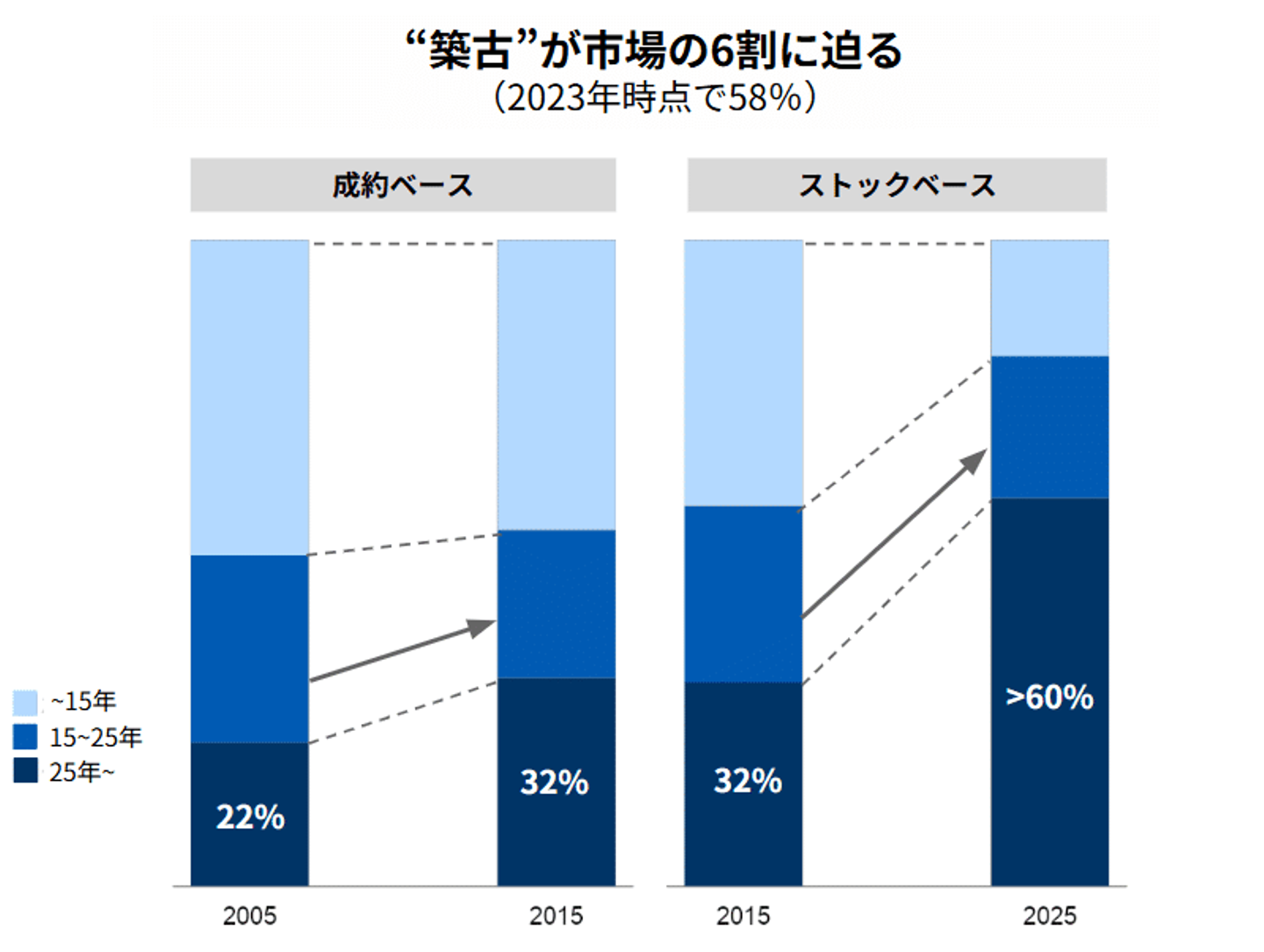 下の図から読み取れる通り、築15年以上の中古マンションの割合は2015年に初めて新築マンションの割合を上回りました。2025年には、一般的にリノベーションが必要になるといわれている築25年以上の”築古”マンションが全体の60%を超過すると推定されています。